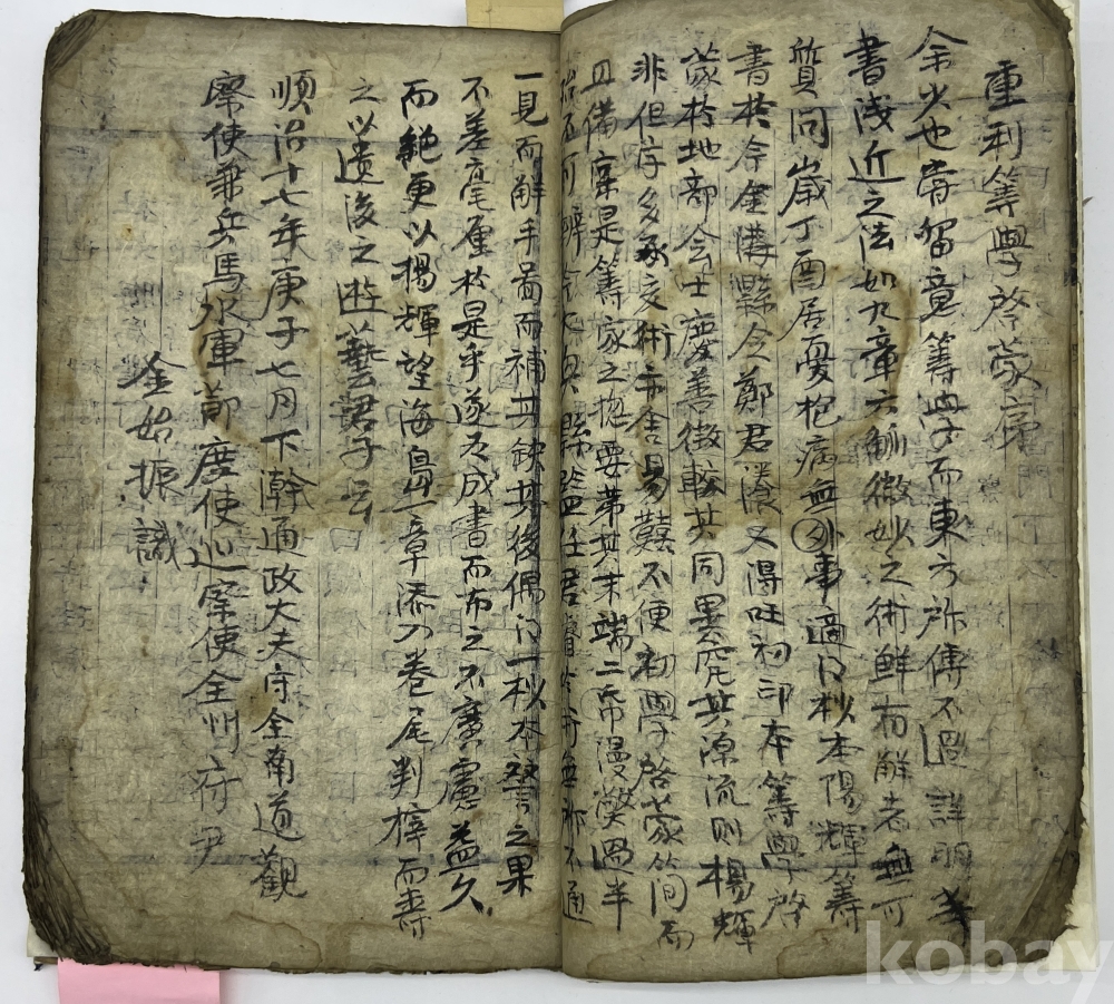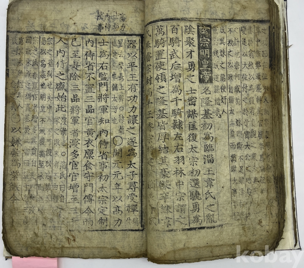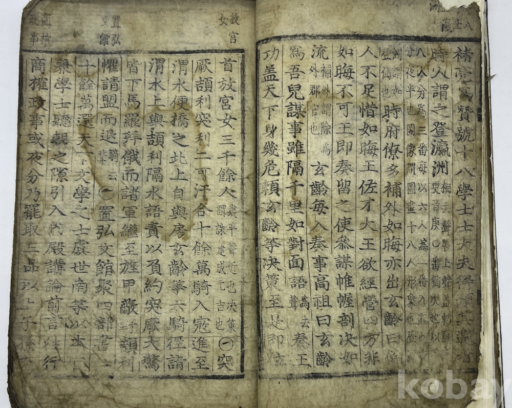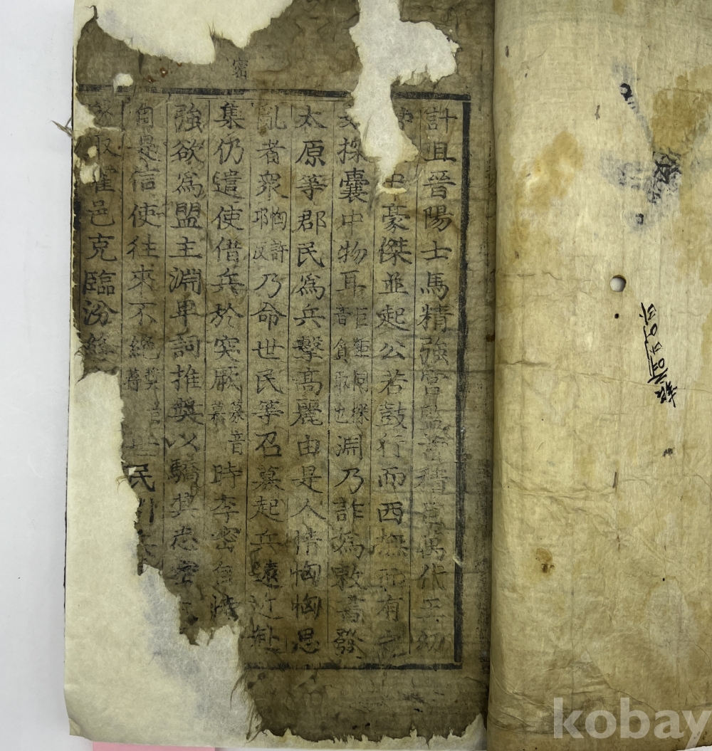 설 명 | 제호와 내지에 권수 표기가 없어 판심제인 ‘사략’을 제목으로 삼았다. 변란에 적힌 정보를 보면 당고조부터 당현종까지의 내용이 담겨있다. 서두와 말미의 많은 장들이 배접 보사되었고, 본문 이면에 많은 분량을 필사로 채웠다. 이에 낙장, 상태를 논하는 것은 의미가 없으며 참고자료 정도로 봐야한다. 이면지의 여러 필사내용을 살펴보면 김시진(金始振)의 ‘중간산학계몽’이 눈에 띄는데 이 서문의 말미를 보면 ‘順治七十年 更子年(1660)’에 전주부윤(全州府尹) 金始振‘라고 쓰여져 있어, 乙未年(1715)의 교정(校正)본에 앞선 것으로 볼 수 있다. 상태 불량. | |||||