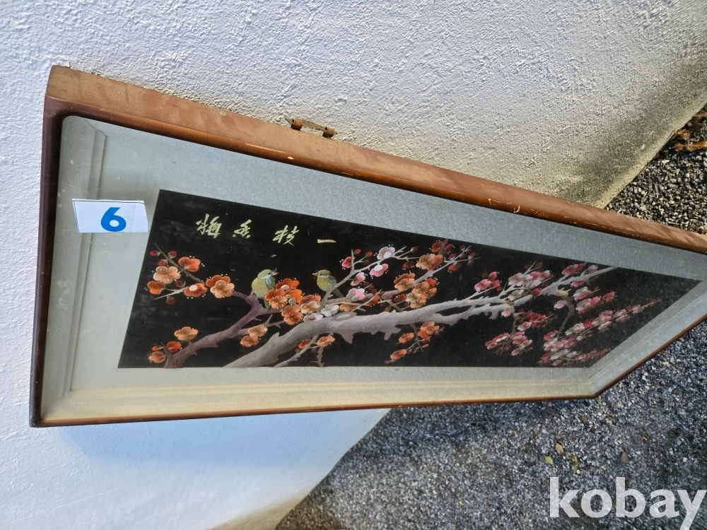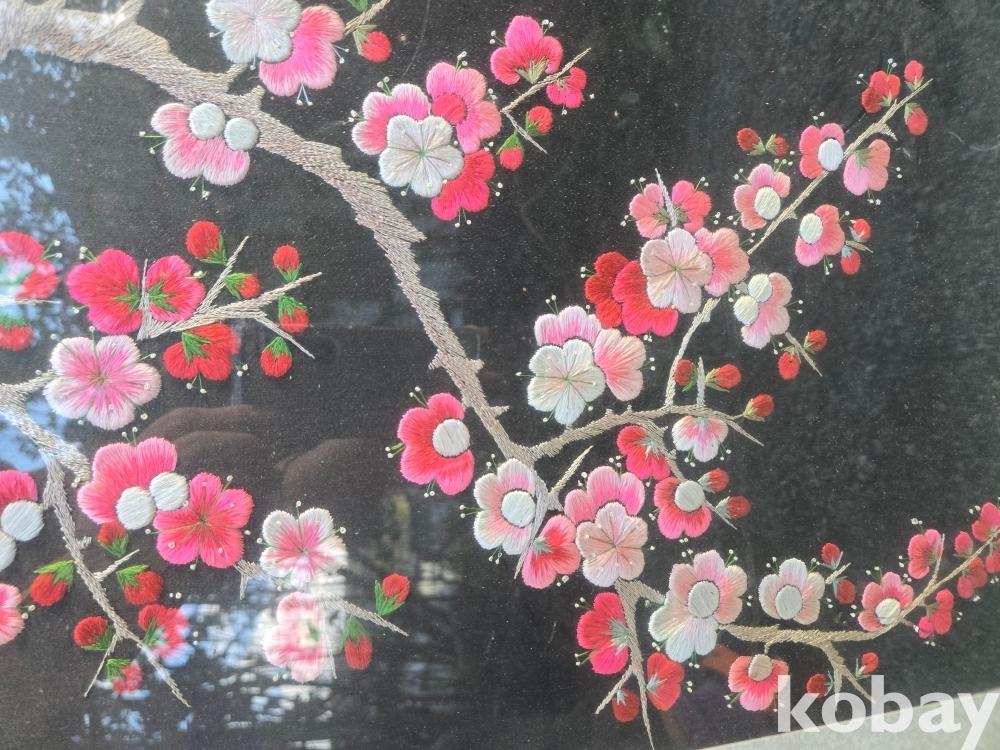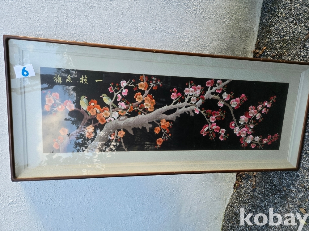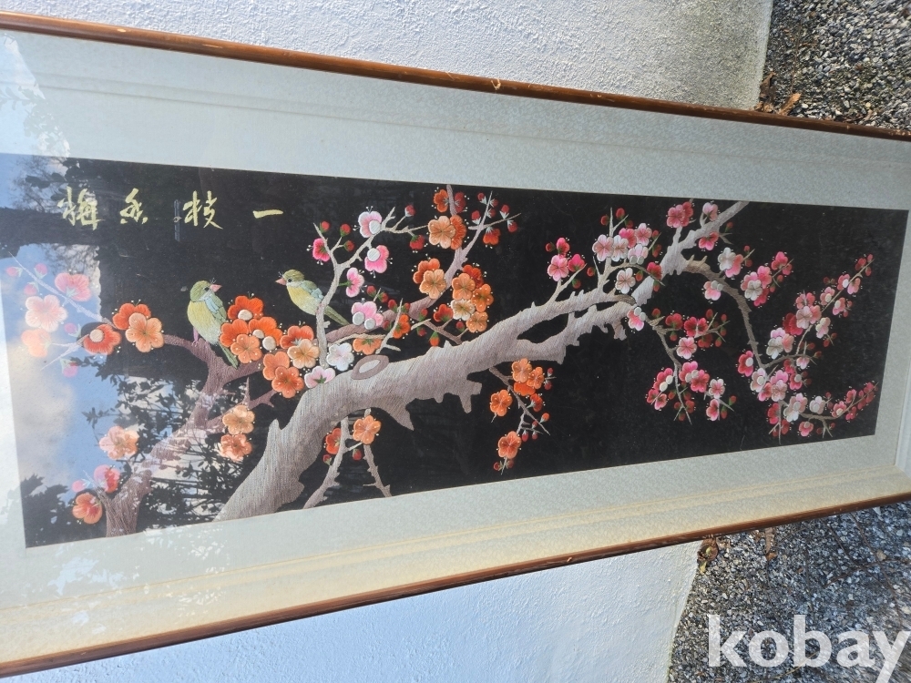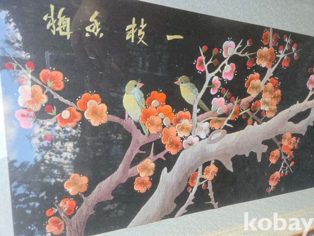 매화 꽃에 새 표현 자수 액자 입니다.