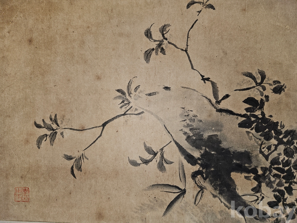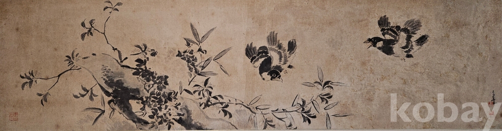 나뭇잎이나 배경의 가지에는 연한 먹(담묵)을 적절히 배치하여