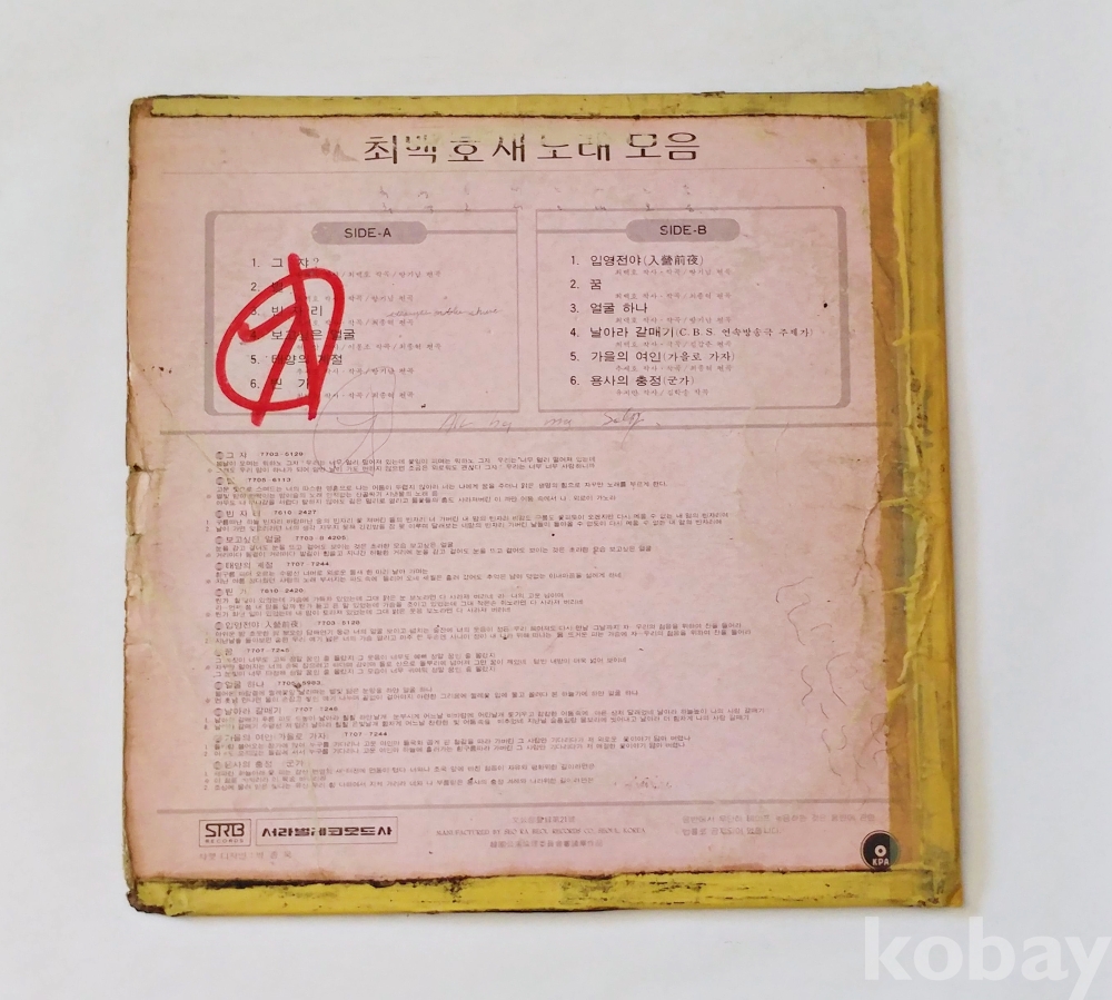 | 자켓상태 | VG : 주름, 접힘, 모서리 찢김 다수 | 음반상태 | EX : 재생에 영향 없는 가벼운 기스 존재 | 발매정보 | 알수없음 | 가사지여부 | 무 |