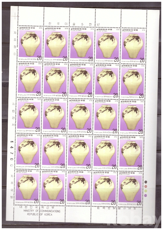 (한국전지) 1979.10.15 한국미술 5천년-백자철회포도문호 sheet of 25 MNH