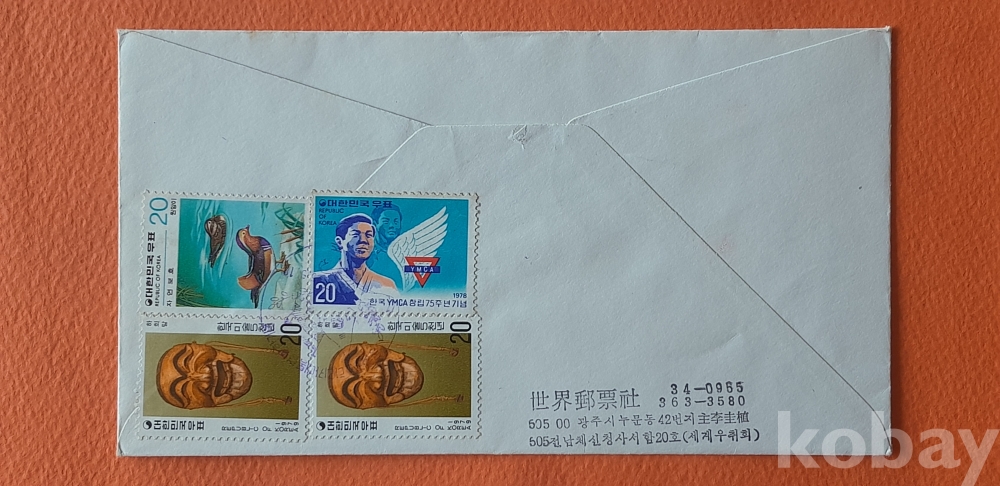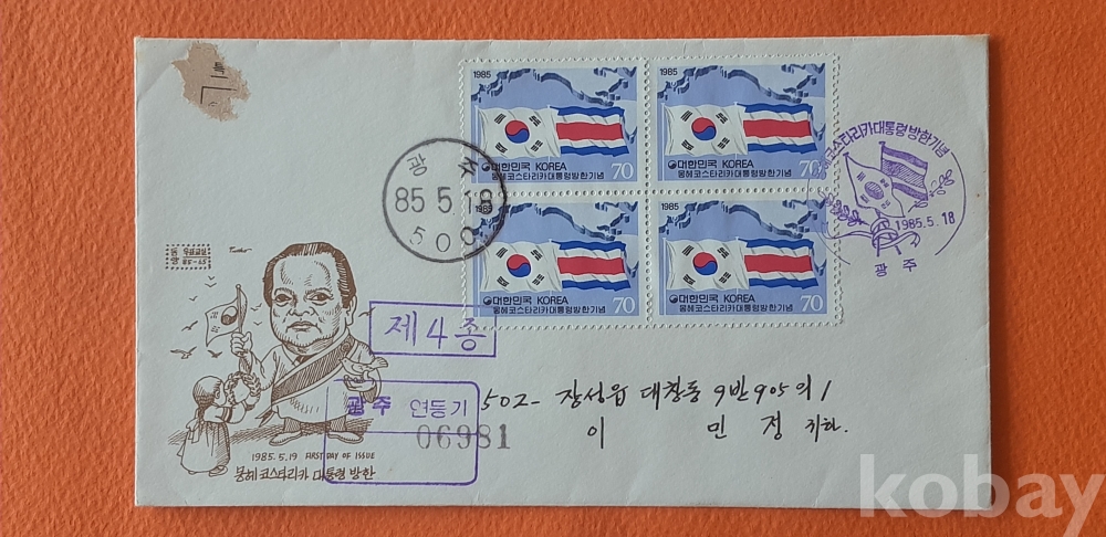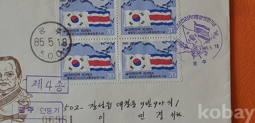 코스타리카 대통령 방한 우표 4매 첩부(광주 소인) 실체봉피 입니다.