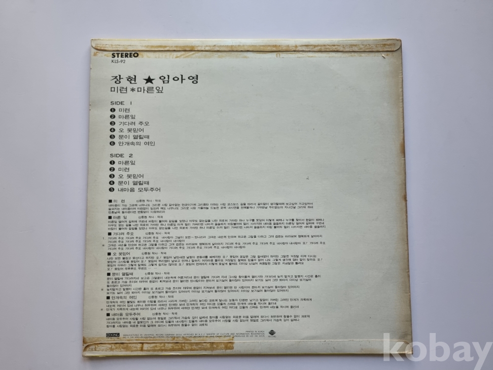 한국 가요사의 전설적인 음반중 하나인 장현.임아영의 1974년 유니버샬 초반입니다.