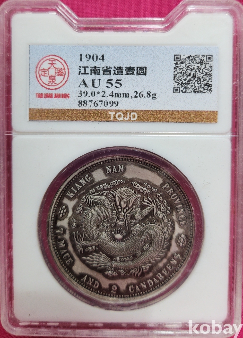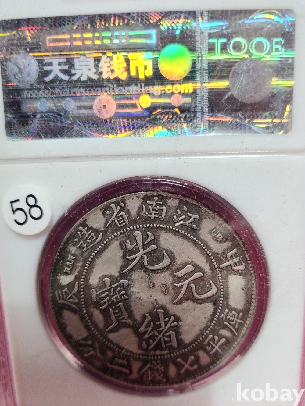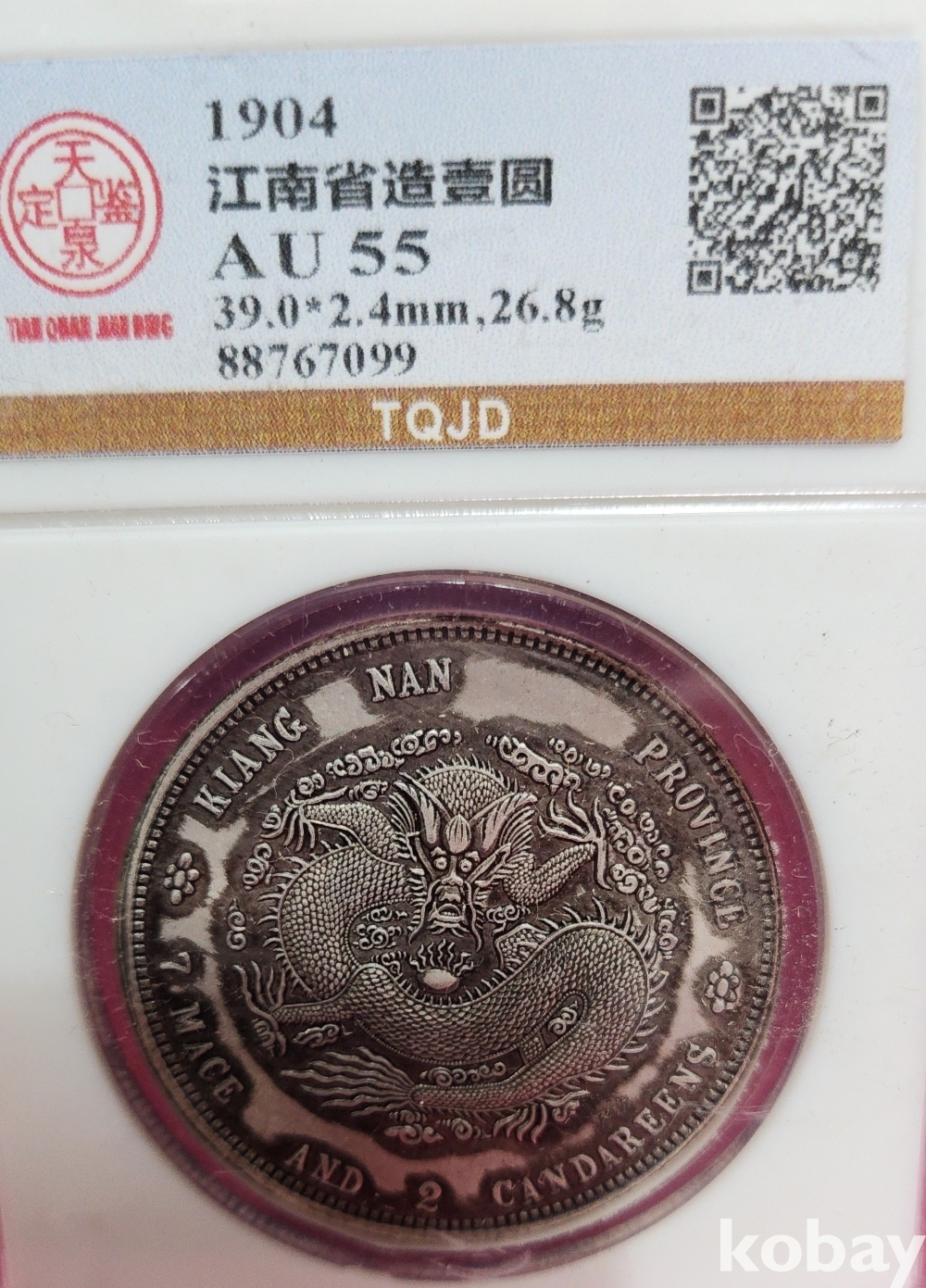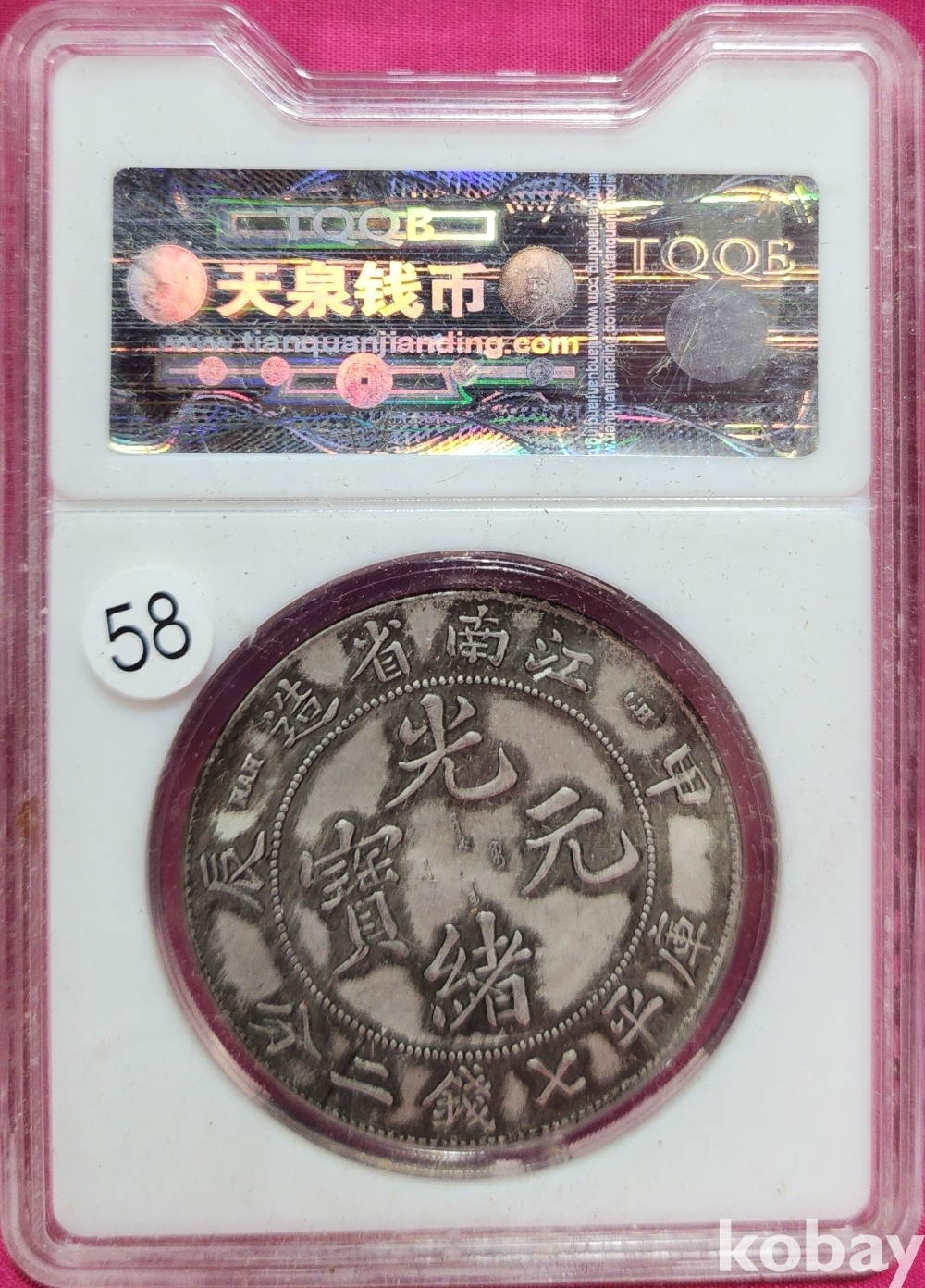 1904년 큐알코드(QR CODE)가 함께하는 은색 광서원보 (光緒元寶) 화패로 밀봉된 상태입니다,