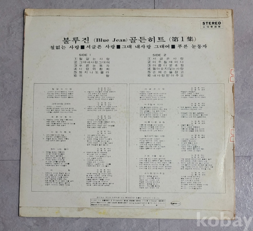 | 자켓상태 | VG : 주름, 접힘, 모서리 찢김 다수 | 음반상태 | VG : 생활 기스 다수, 가벼운 노이즈 존재 | 발매정보 | 알수없음 | 가사지여부 | 무 |