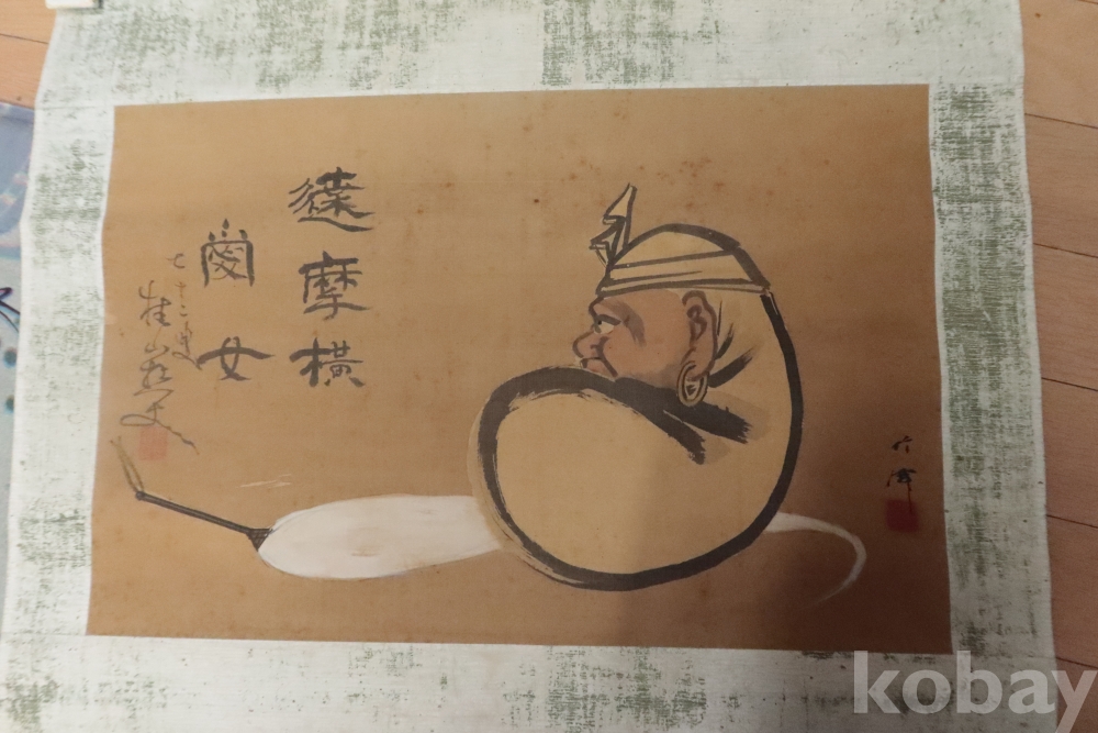 일본 달마 족자 임니다 멋진 디자인 고태미를 가진 명화 이며 여색?을 경계한 내용이 보임니다 자세한건 사진 참조 하세요
