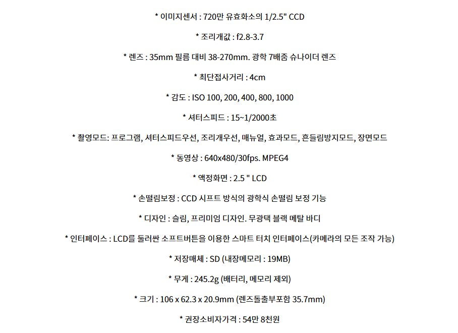구성: 바디,충전기 세트(삼성 동일 메이커 호환용 신품), 도시바 SD 카드 2GB, 밧데리.