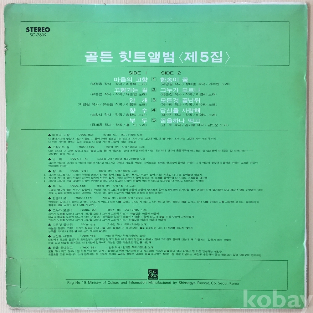 1. 마음의 고향(이용복) 2. 고향가는 길(유승엽) 3. 안개(이용복) 4. 향수(송창식) 5. 부두(홍민) | 1. 한송이 꿈(이수만) 2. 그누가 모르나(이영식) 3. 모든것 끝난뒤(이수만) 4. 당신을 사랑해(이영식) 5. 꿈을 하나 먹고(김인순) |