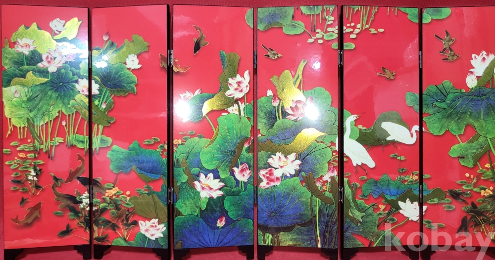 방고소병풍(仿古小屛風)6곡(谷) 연꽃(蓮花)문양 장식용 미사용 소병풍입니다,