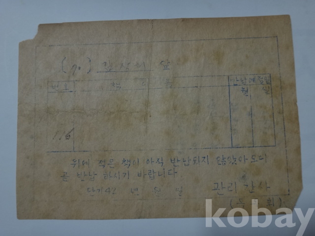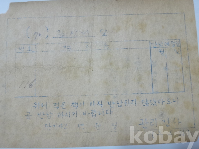 책 반납 안내 - (뒷면) 여학사, 바귀의 늪 등, 분실 1959.8. (독우회, 관리 간사)