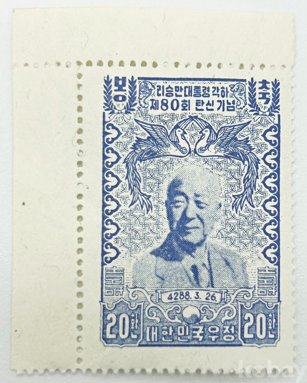 상품 설명 | 1955년 3월 26일 발행된 이승만 대통령 80회 탄신 기념 우표이다. 액면가는 20환이며, 미사용이다. | ||