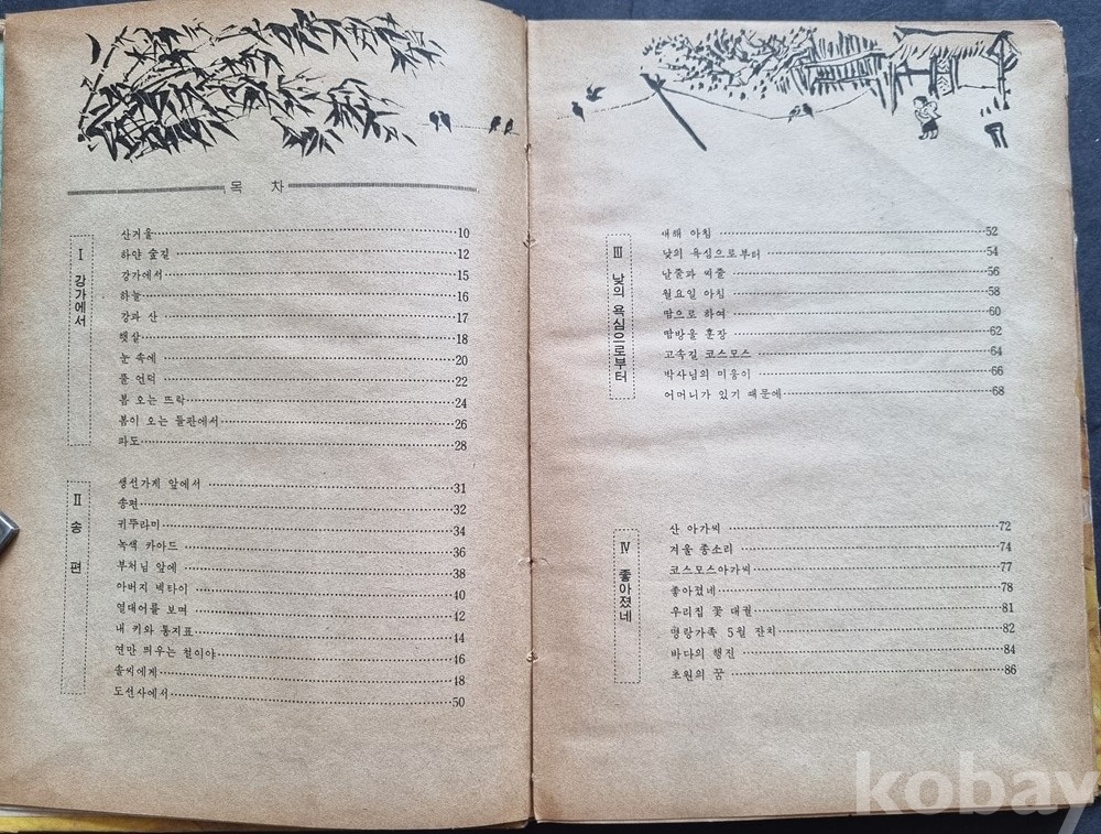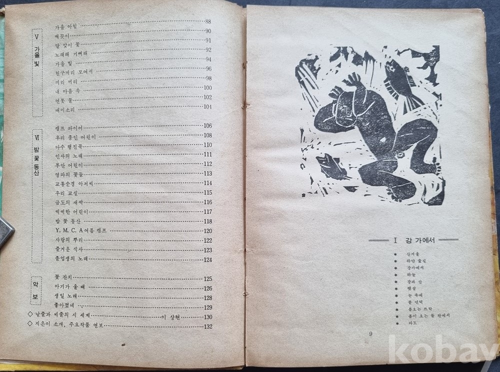 구성: '강가에서', '송편', '좋아졌네' 등 다수의 동시·동요와 함께 '꽃잔치', '아기가 울 때' 등의 악보가 수록되어 있습니다.