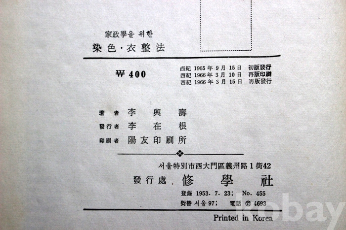 가정학을 위한 "염색. 의정법"- 이흥수 著 / 1966년 / 수학사 발행
