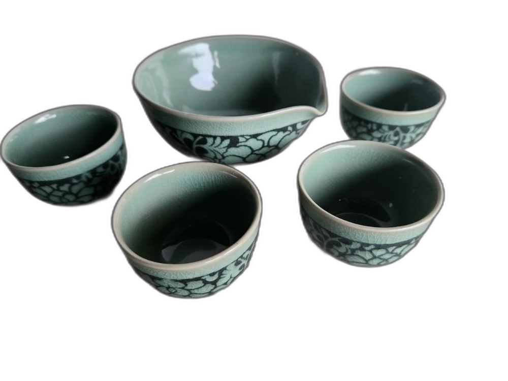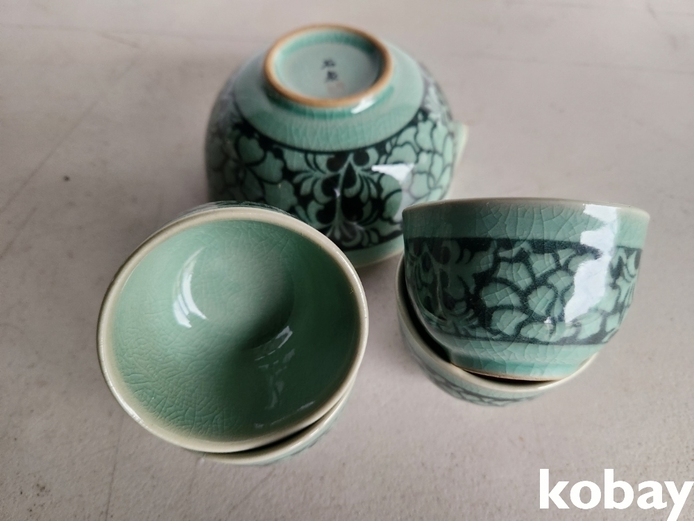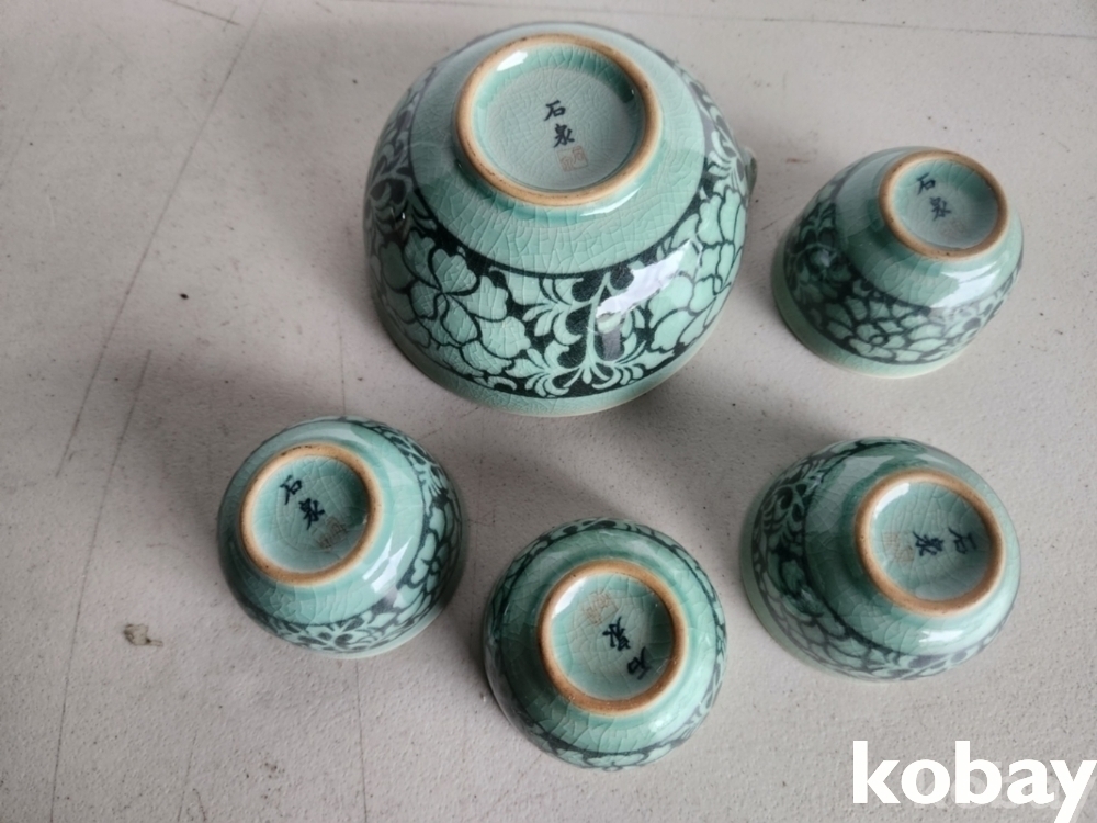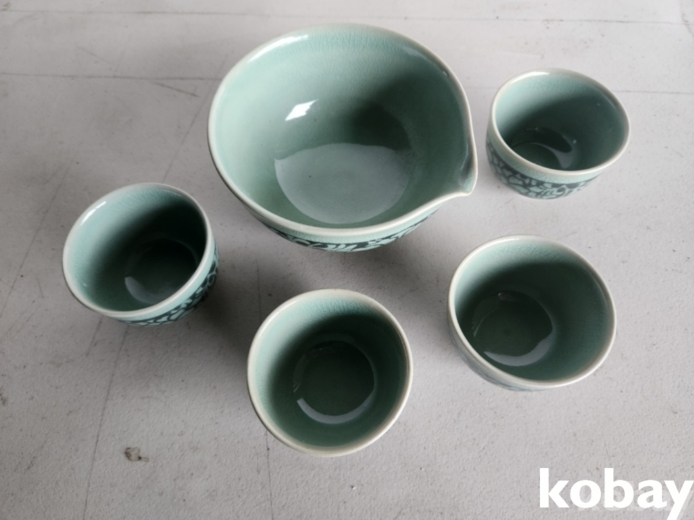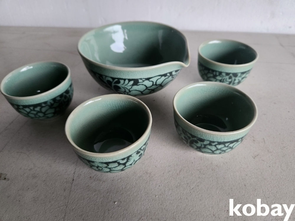 꽃 문양이 있는 다기 잔 4개와 숙우 입니다.