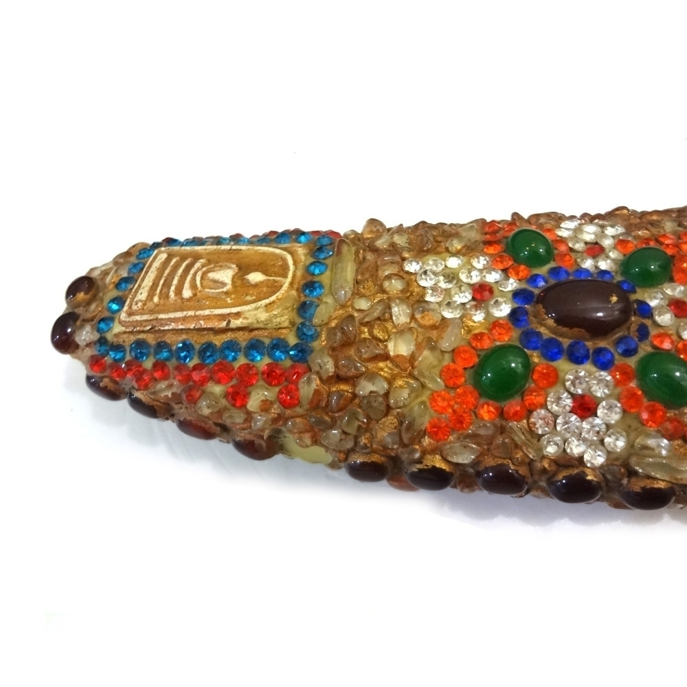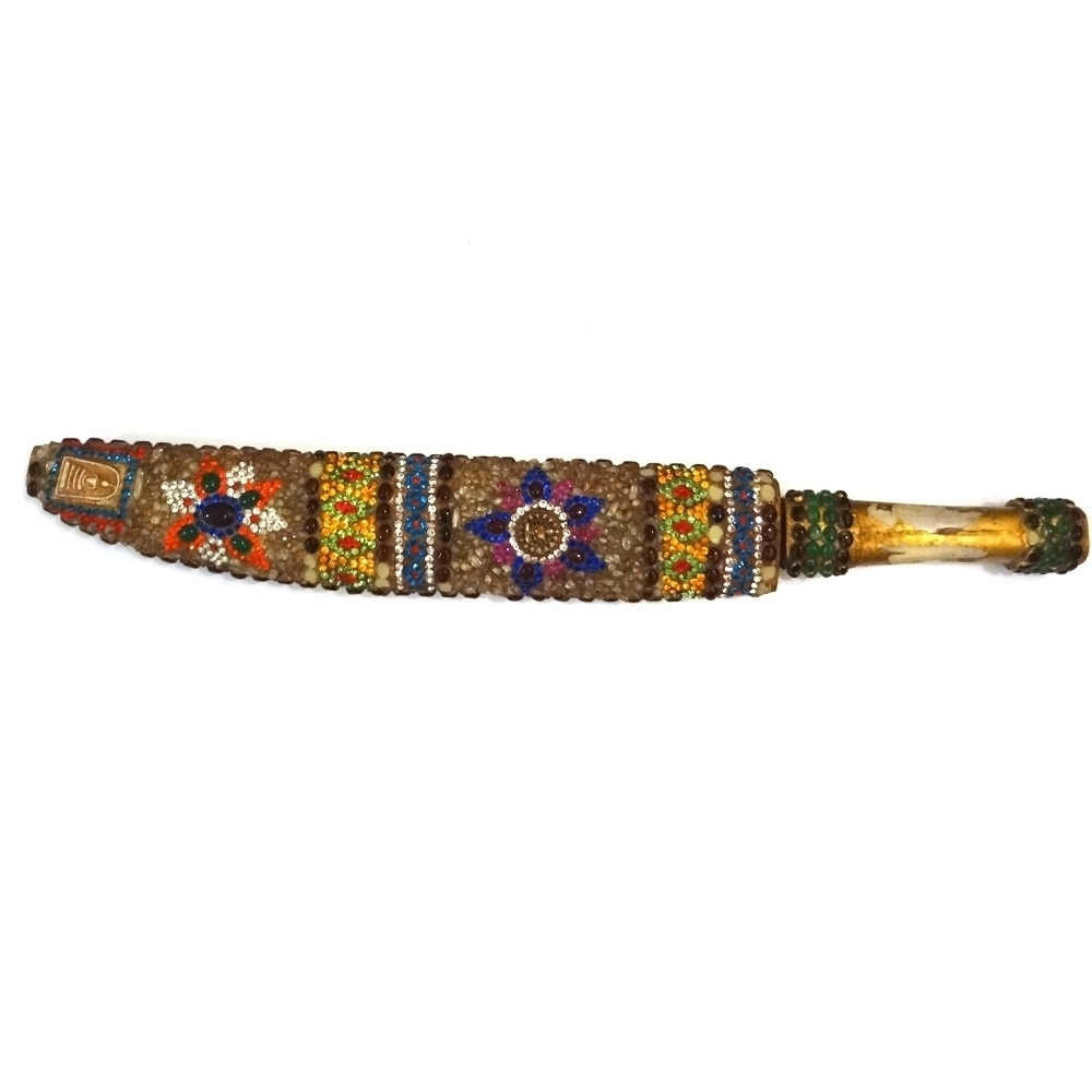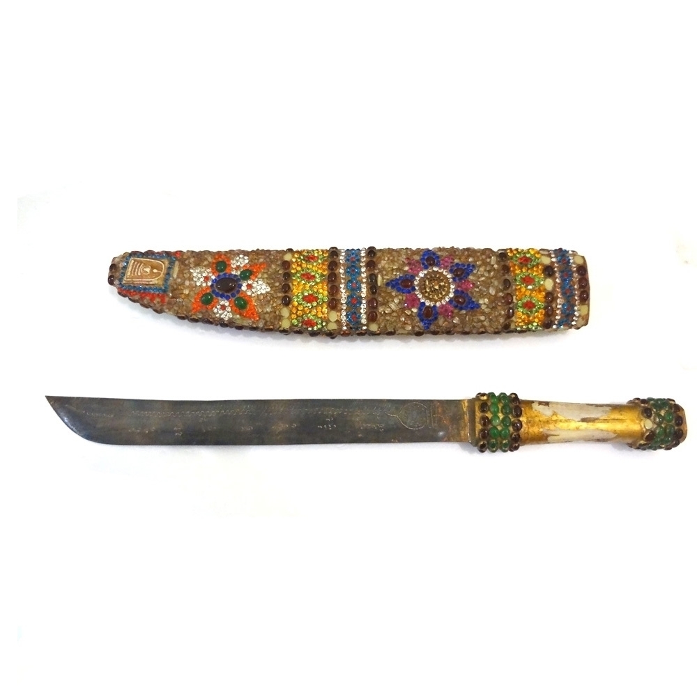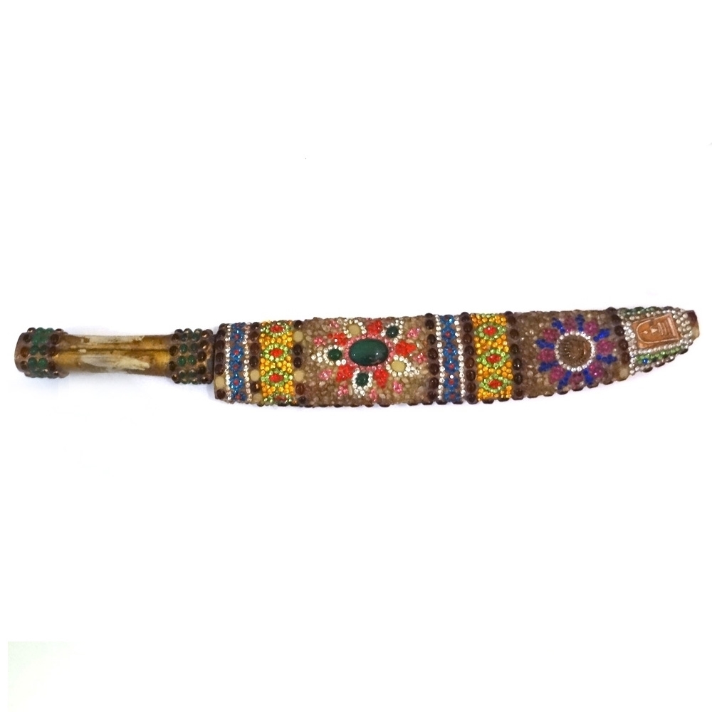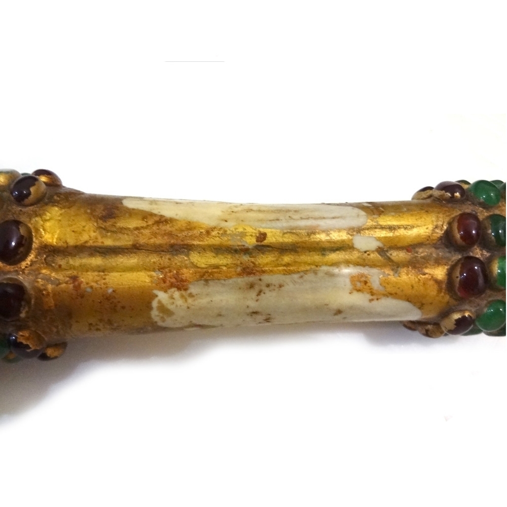 손잡이가 짐승의 뼈재질로 만들어졌으며 몸통위에 마노석과 수정재질로 악세사리형태로 만들어진