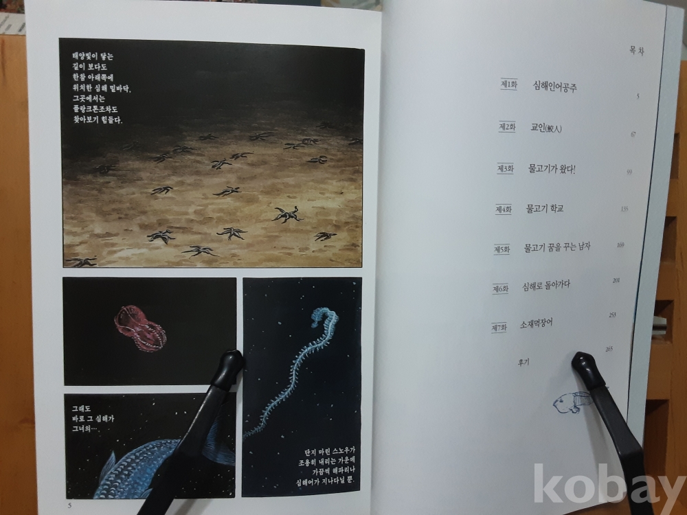 1. 신화속 공상의 조류나 생명의 근원을 품고 있는 바닷속 생명체로서의 어류를 그리고 있다. 비일상적인 현실을 소재로 이형의 존재들이 펼치는 기괴한 이야기들이 옴니버스로 묶여있다.