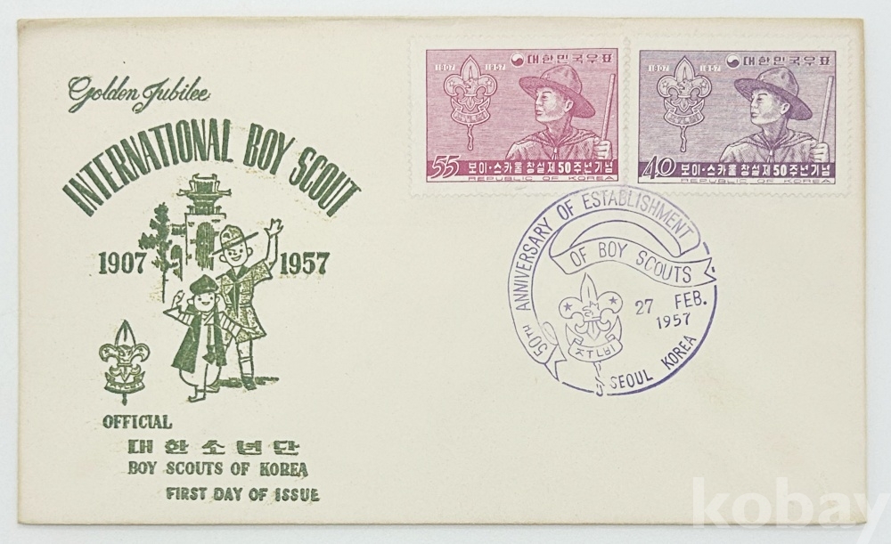 상품 설명 | 1957년 2월 27일 보이스카우트 창설 50주년을 기념하여 발행된 초일봉피이다. 2종의 우표가 부착되어있다. SEOUL, KOFRA 기념인. | ||