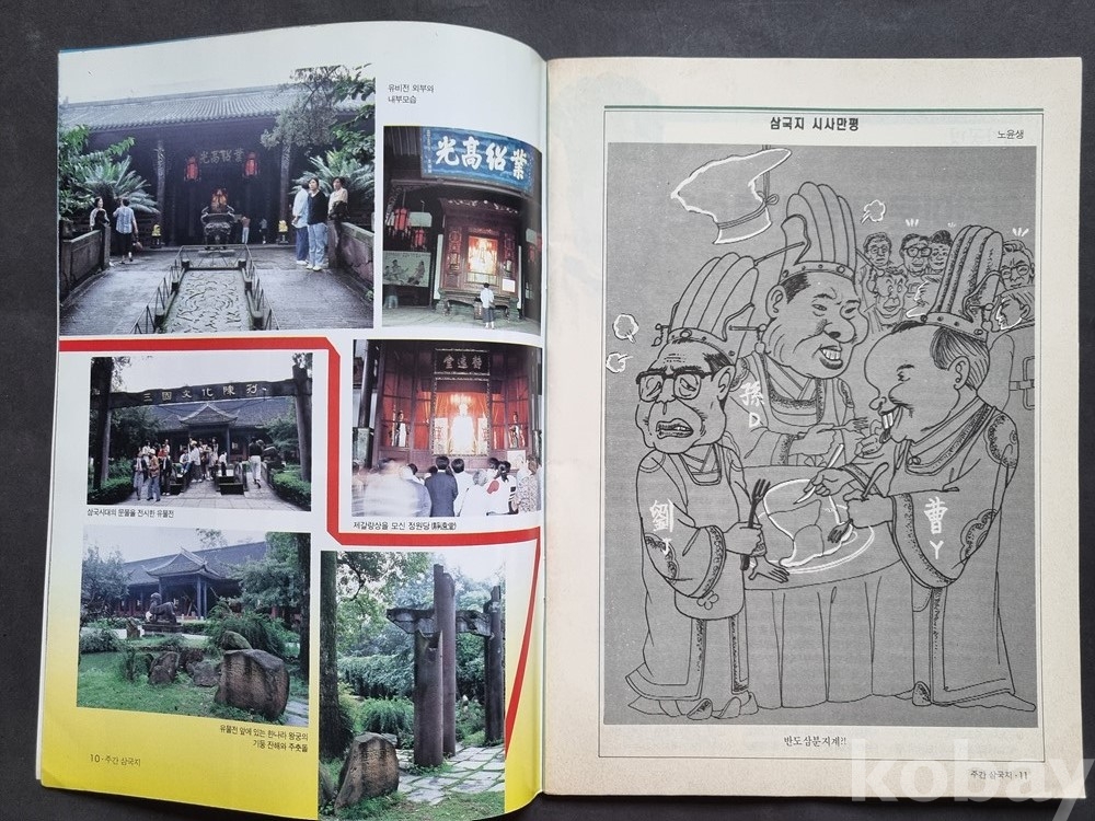시각 자료: 삼국지 관련 유물 사진, 캐릭터 일러스트, 그리고 당대의 시대상을 담은 시사 만평 수록