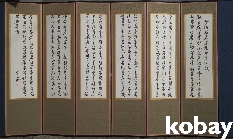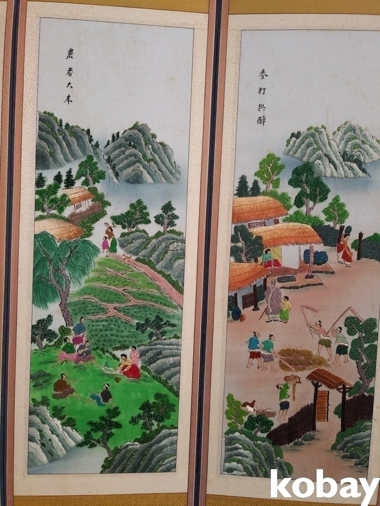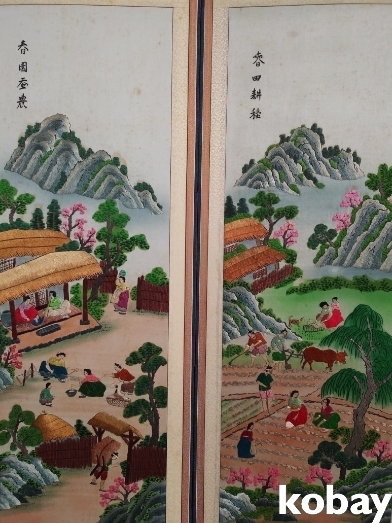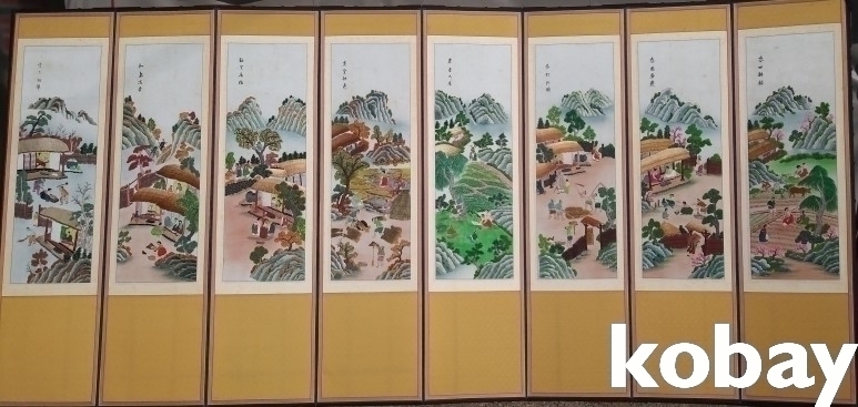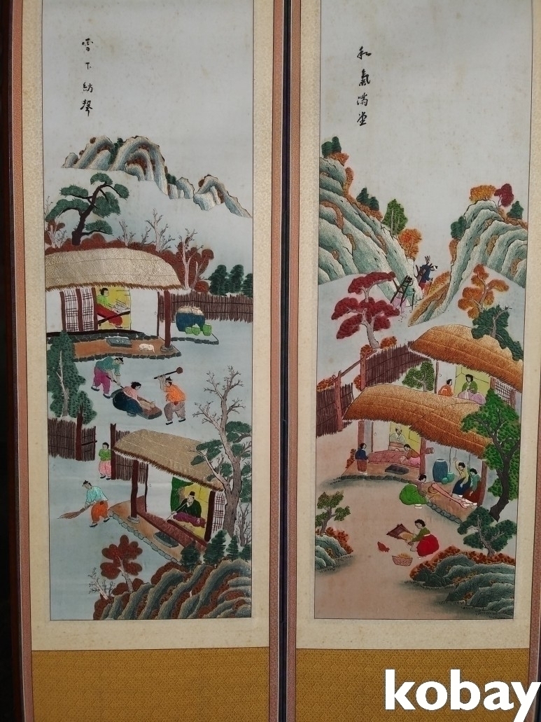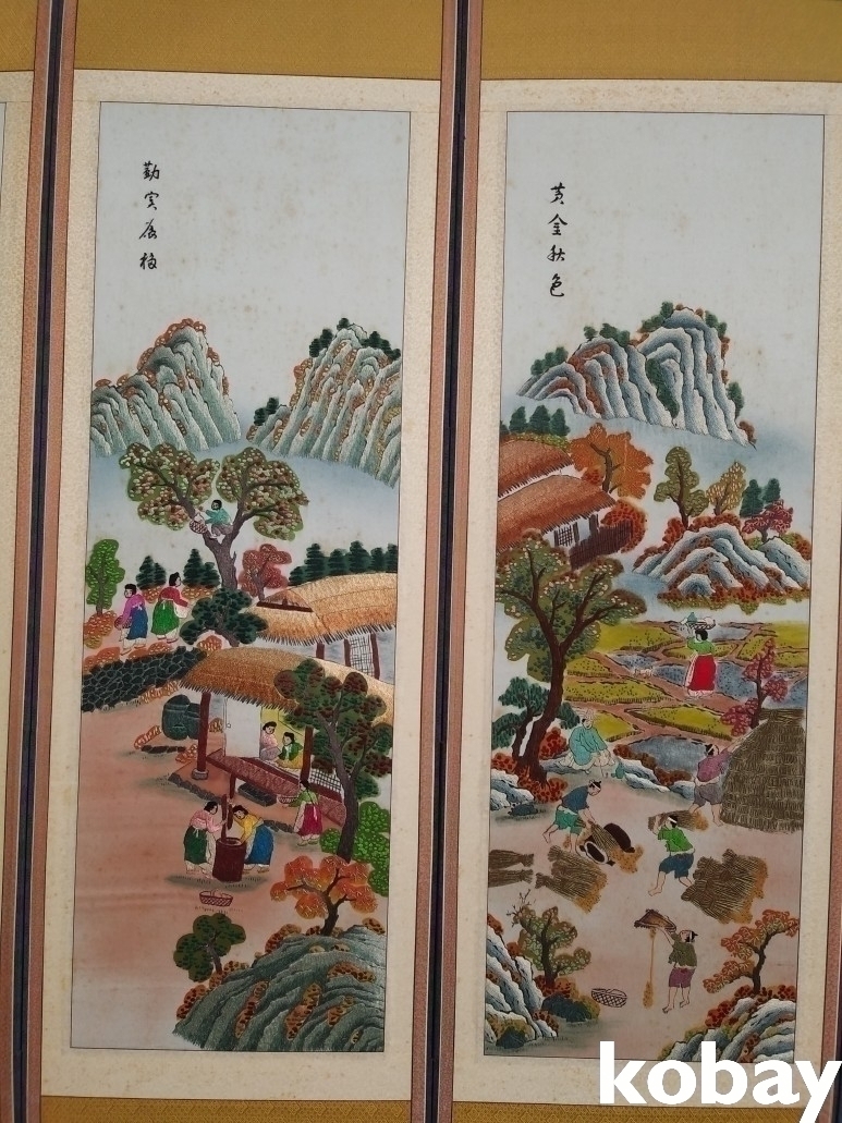 마을 생활 풍속을 자수로 표현한 8폭 병풍 입니다.