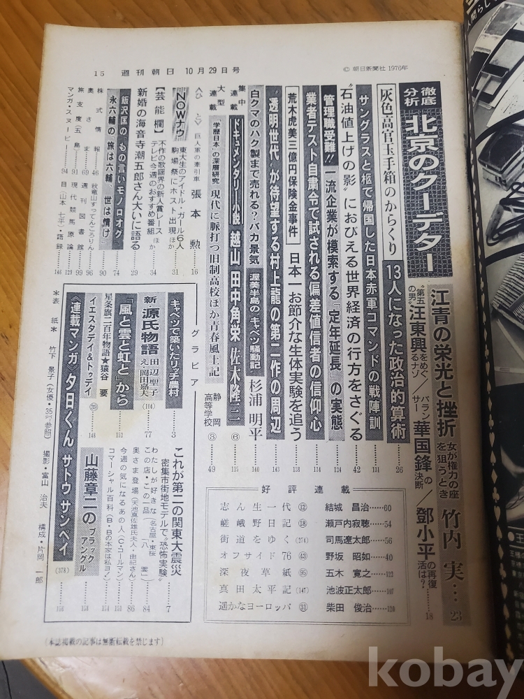 1. 주간 아사히(週刊朝日) 통권 3039호, 조일신문사, 1976년, 158쪽, 표지모델 배우 다케시다 게이코, 일본판, 상태 상, 사진 참조