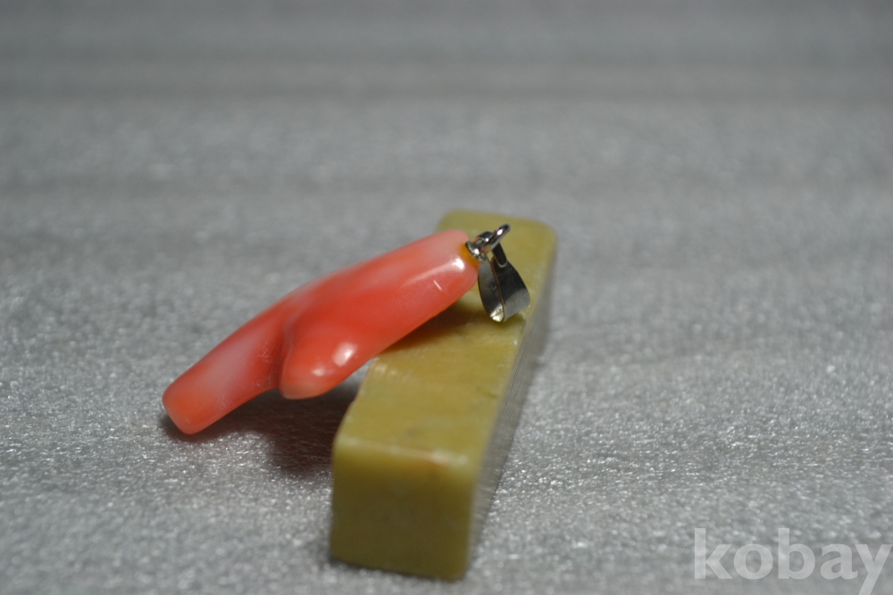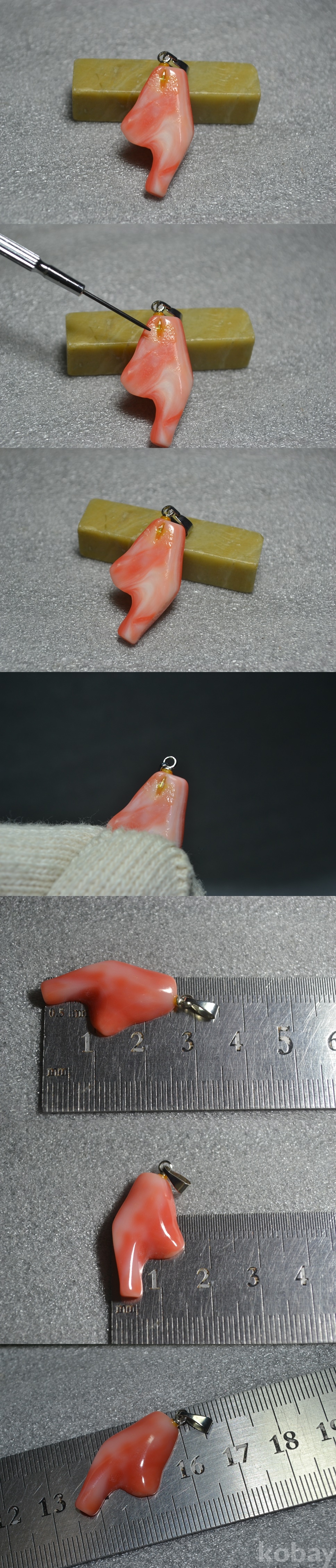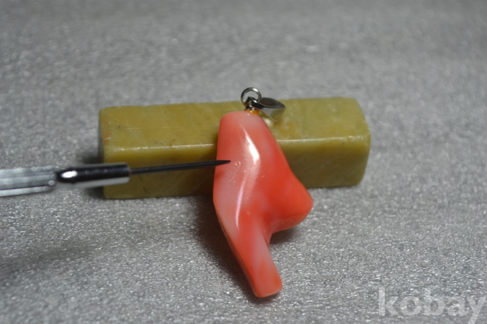 ㅡ> 산호펜던트의 앞면을 보시면 사진상으로는 잘 안보일수 있지만 미세한 접착이물질 묻은 흔적이 1곳 있습니다. (검은핀으로 가르킨 부분 4번째 사진참조)