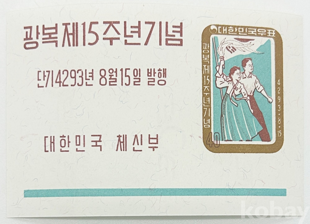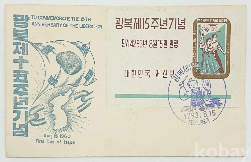 상품 설명 | 1) 1960년 8월 15일 광복 제15주년을 기념하여 발행된 초일 봉피, SEOUL KOREA 기념인. 2) 광복 제15주년 기념 미사용 우표, 액면가 40환. | ||