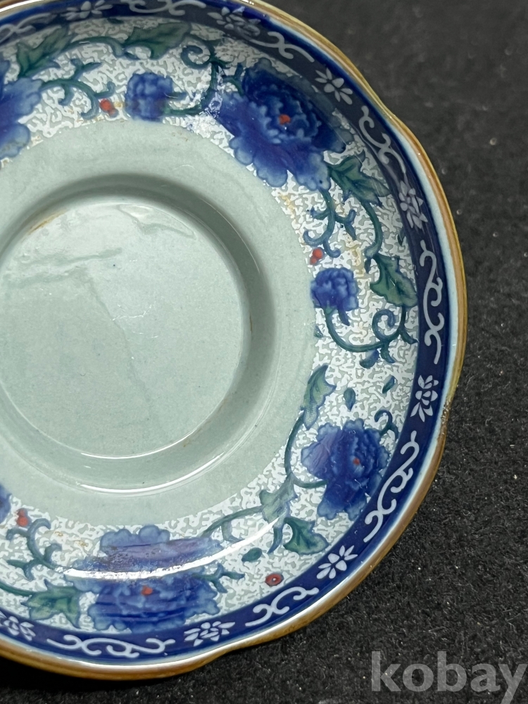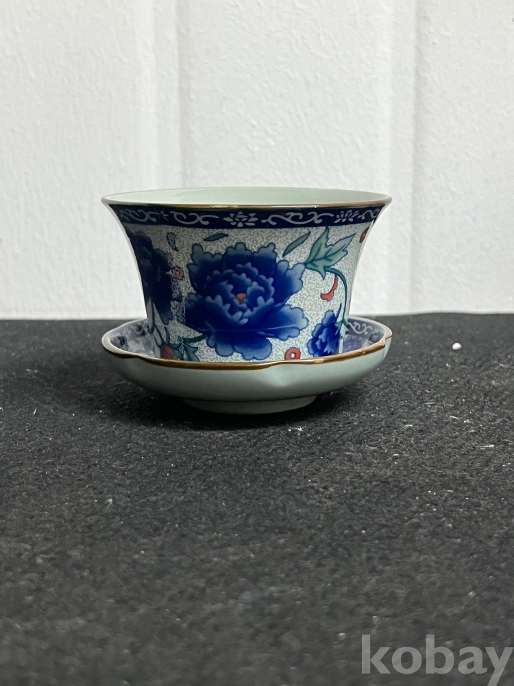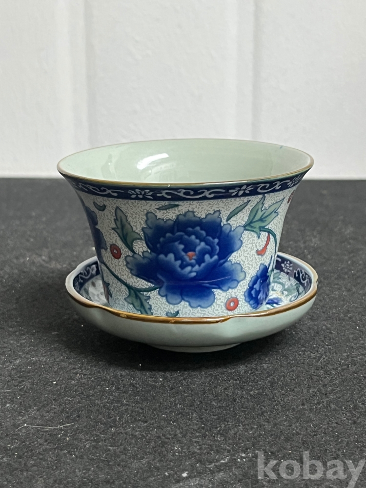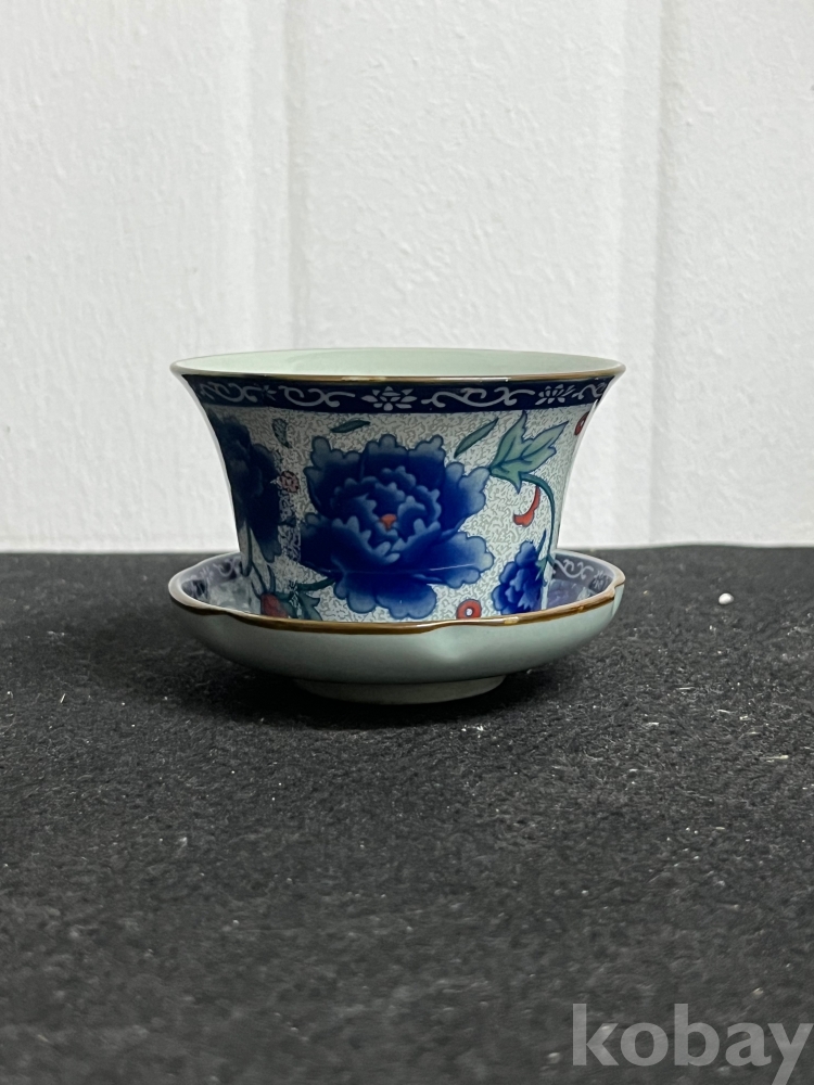 화사한 화훼문이 시문된 잔과 잔대를 한 벌로 갖춘 기물입니다.