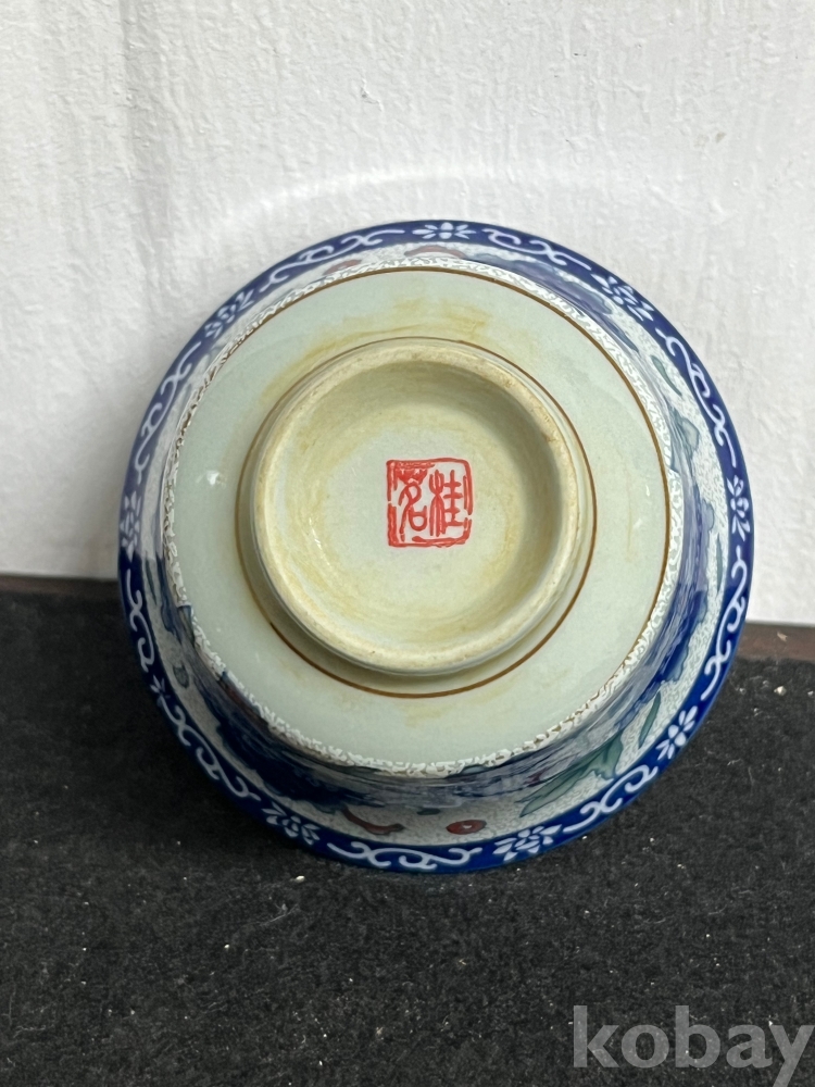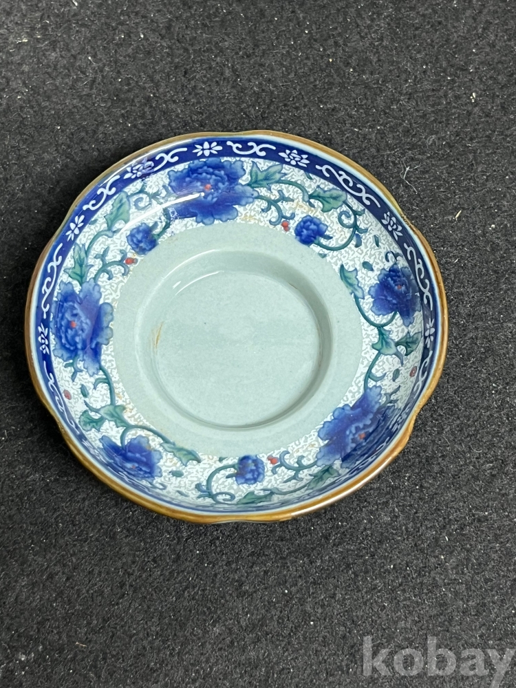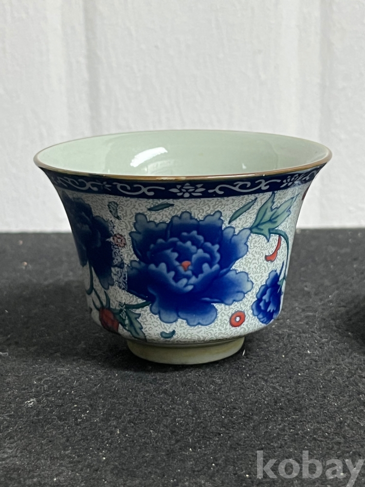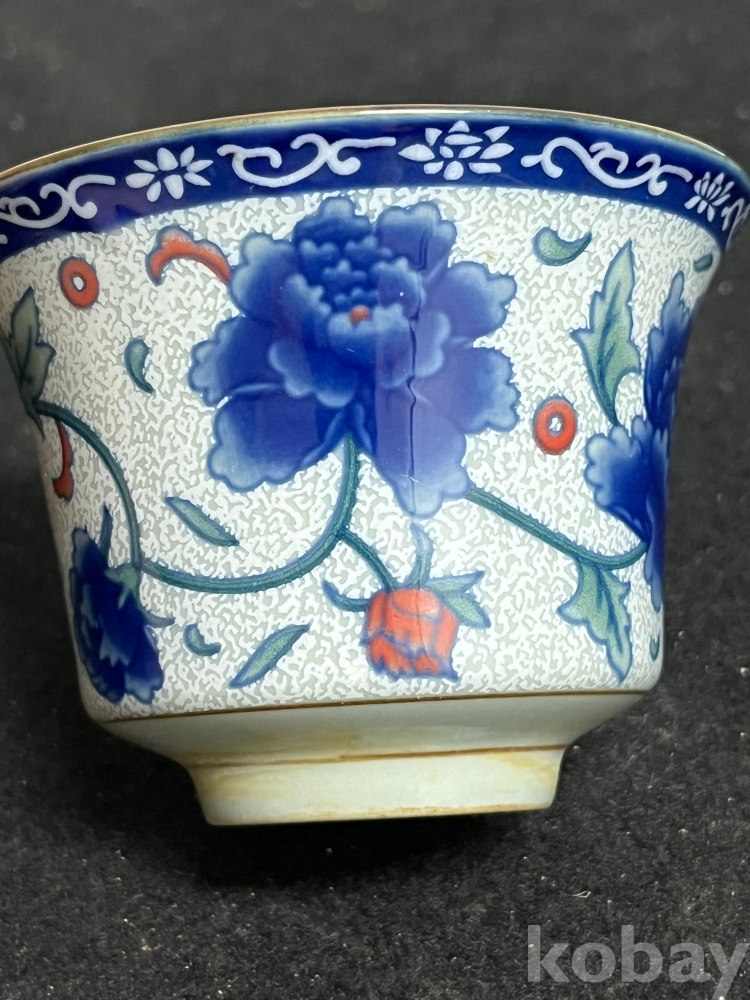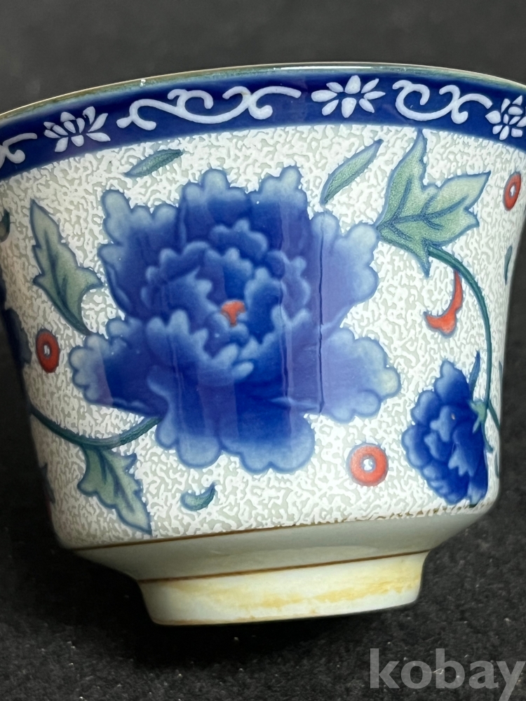 화사한 화훼문이 시문된 잔과 잔대를 한 벌로 갖춘 기물입니다.