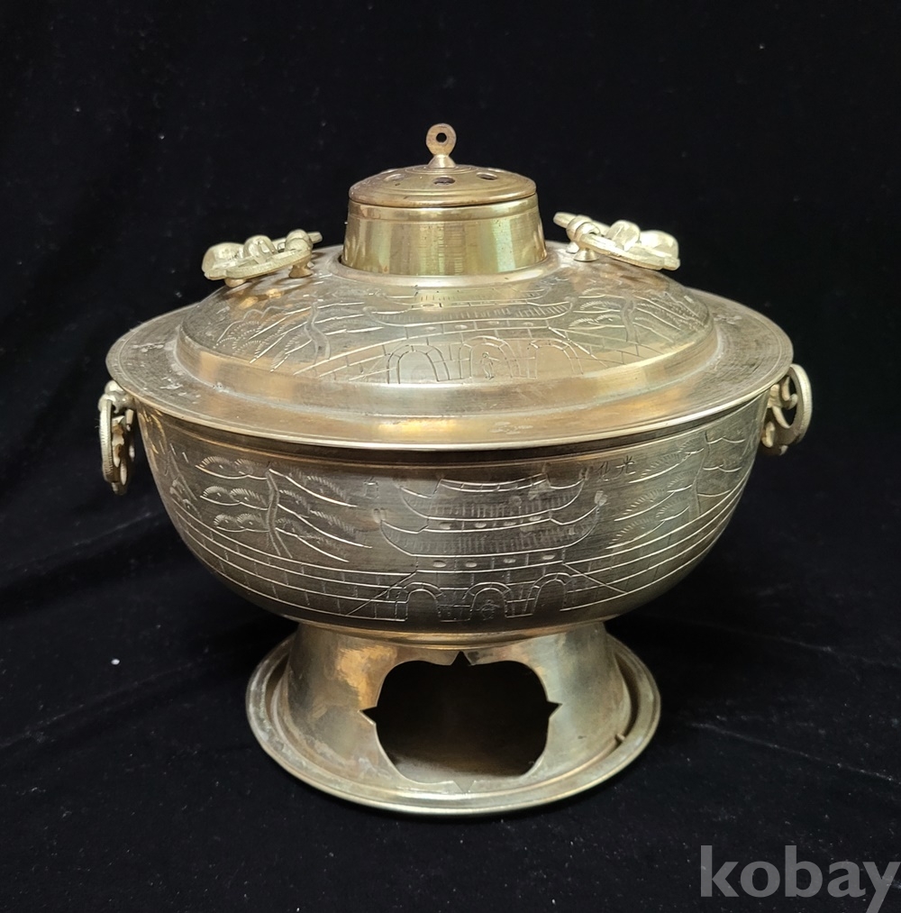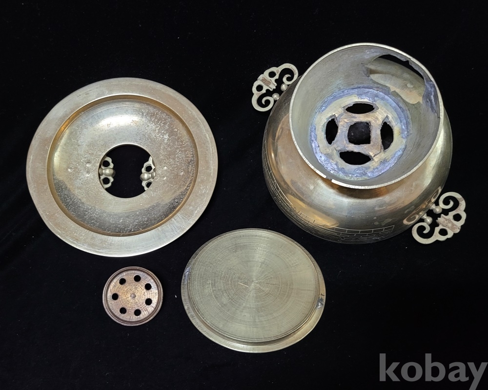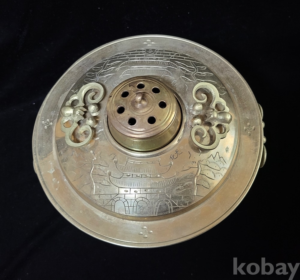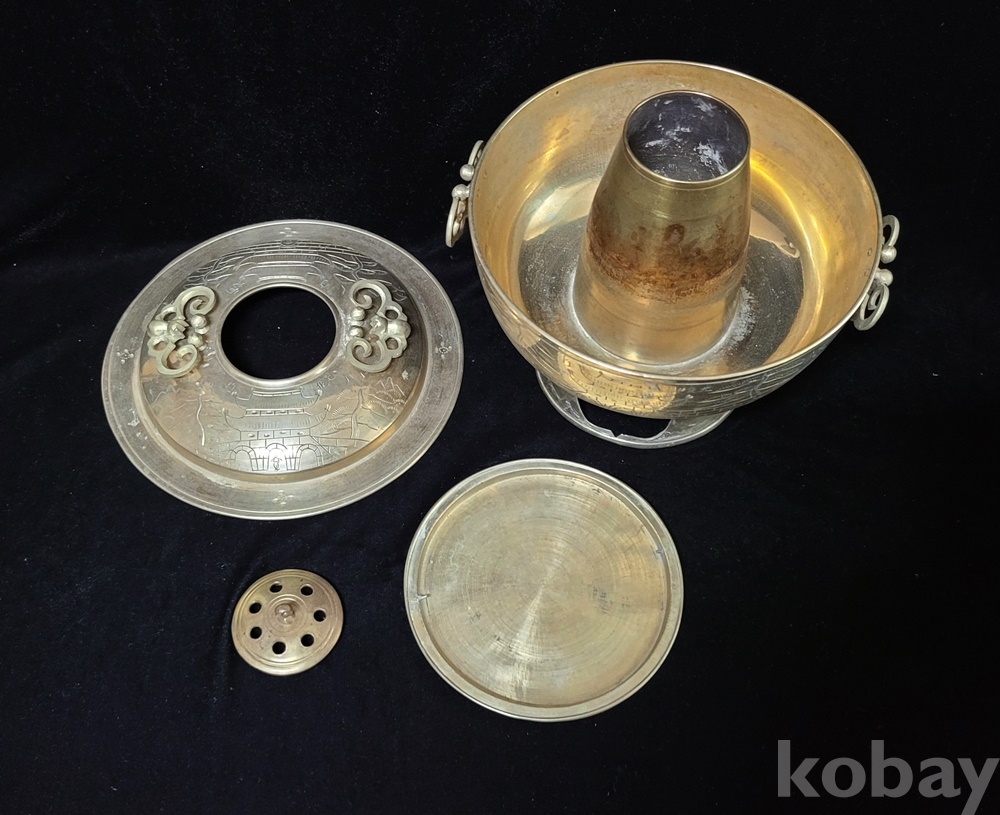 화구 뚜껑 덮게 몸통 받침 4단 분리에 손잡이는 박쥐 형이고 덮개와 몸통은 光化門 南大門 문양이 음각되어 있으며 대형입니다.