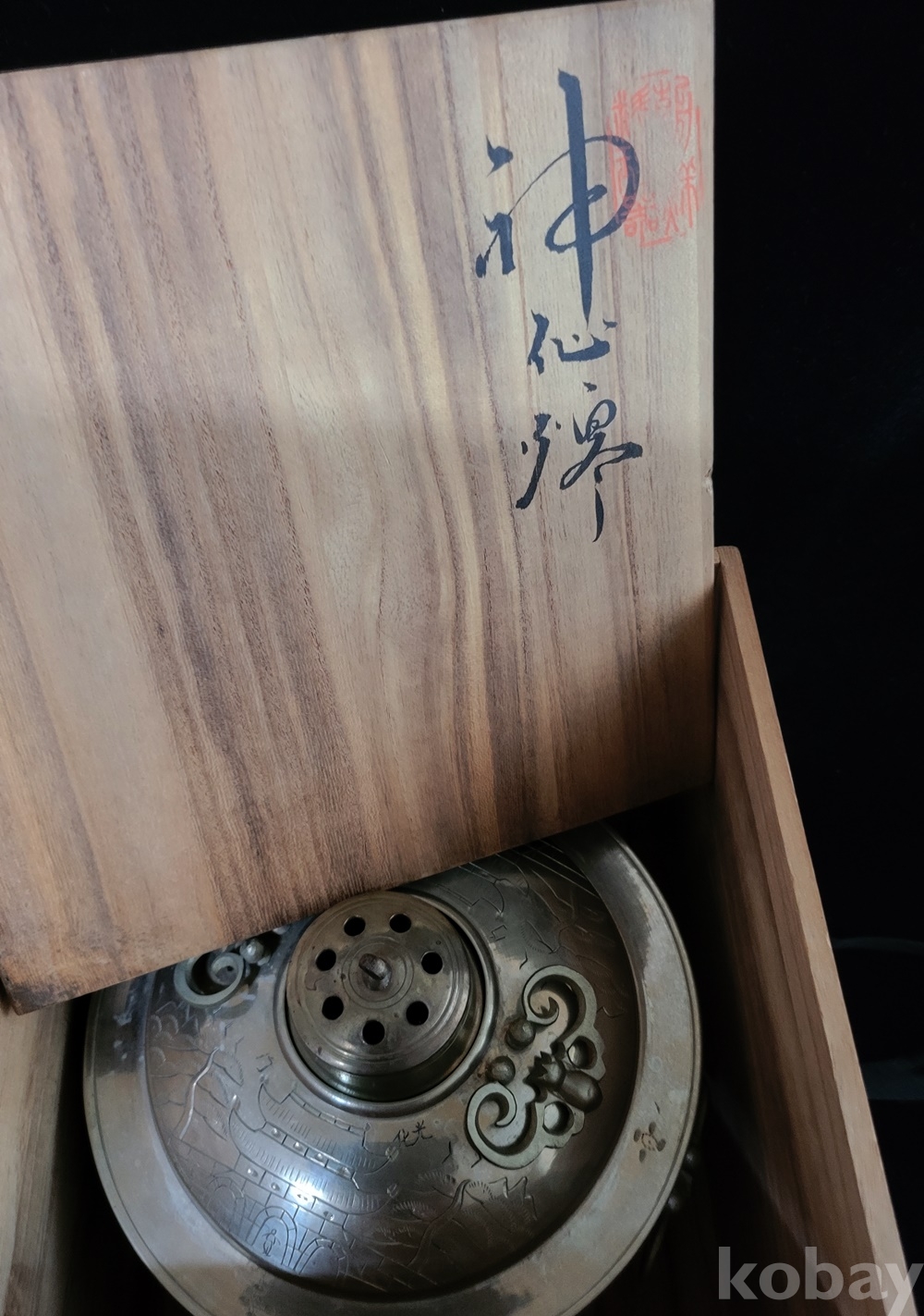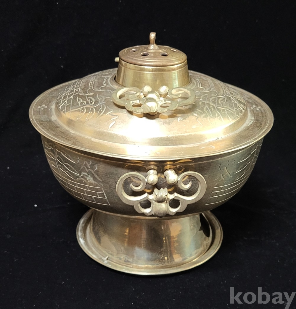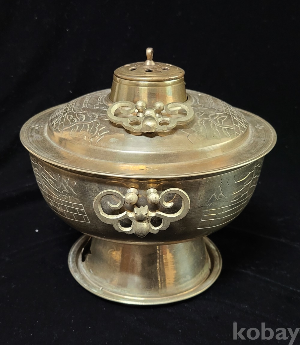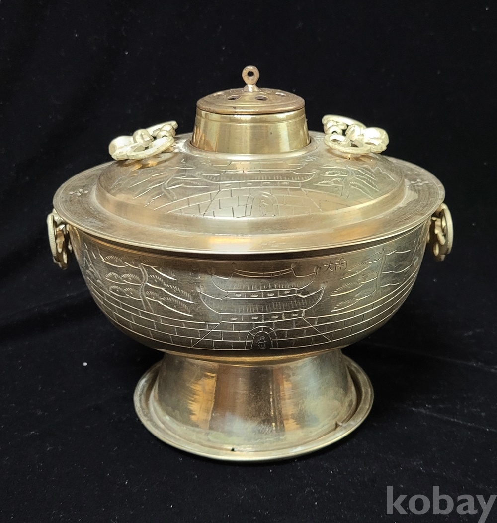 화구 뚜껑 덮게 몸통 받침 4단 분리에 손잡이는 박쥐 형이고 덮개와 몸통은 光化門 南大門 문양이 음각되어 있으며 대형입니다.