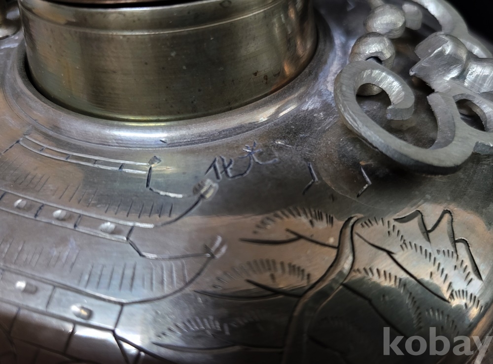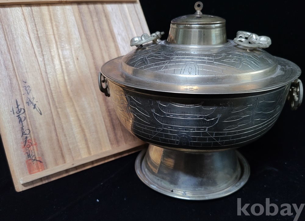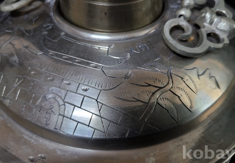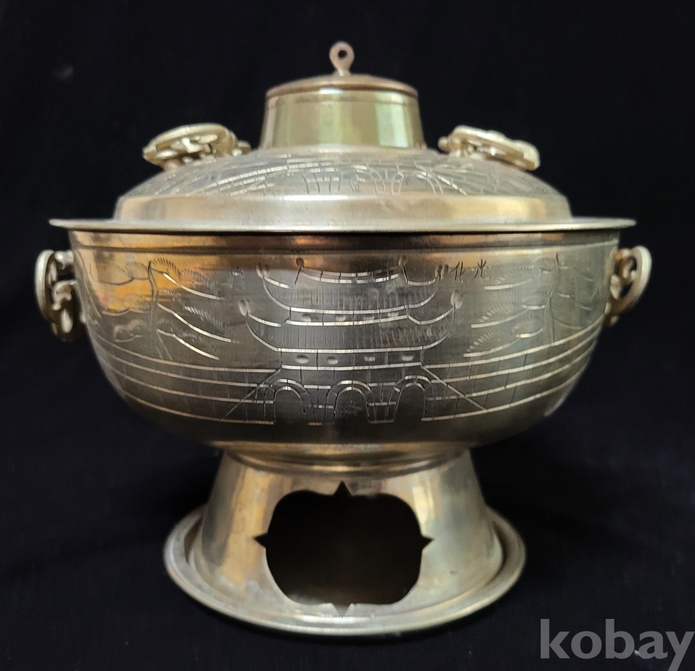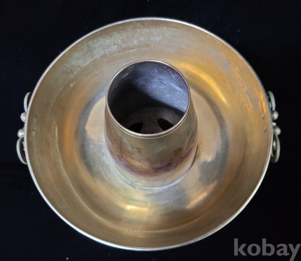 신선로는 화구의 뚜껑이 없으나 海市商會製品만이 뚜껑 있는 희귀품이며 본체의 굽 내부(이미지–7) 회색은 수리 흔적이 아닌 제작 당시 상하 접합 땜 흔적입니다.