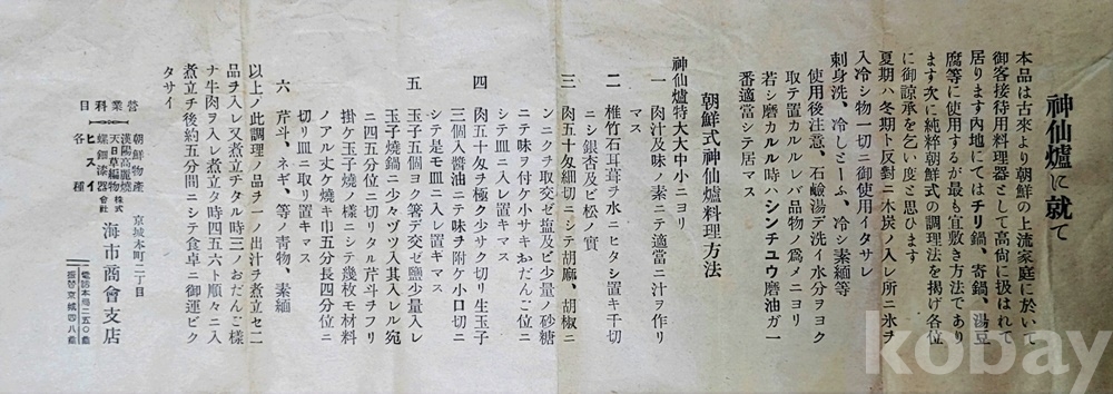 덮게 외측 “神仙爐” 내측 “京城 海市商會製”기록 날인 된 상자에 신선로와 日本語 판 “신선로에 대하여 神仙爐に就て”紙에 “朝鮮式神仙爐料理方法”의 자세한 설명서(이미지–13)가 보존되어 있습니다.
