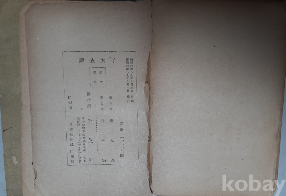 마의태자 상하 합본-이광수 저 1956년초간 광영사 발행