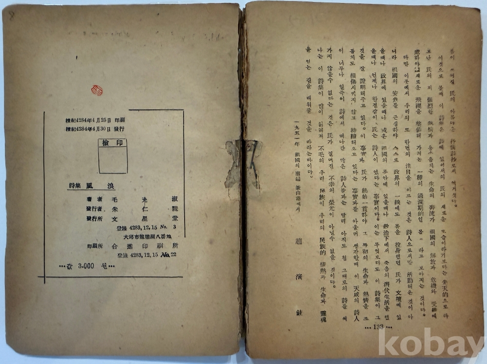 물 품 명 | <취향지가> [39] 1951년 발행, 한국전쟁의 비극을 고발한 대표 여류시인 모윤숙(毛允淑)의 제3시집 [풍랑(風浪)] 초판본 1책 | |||||
