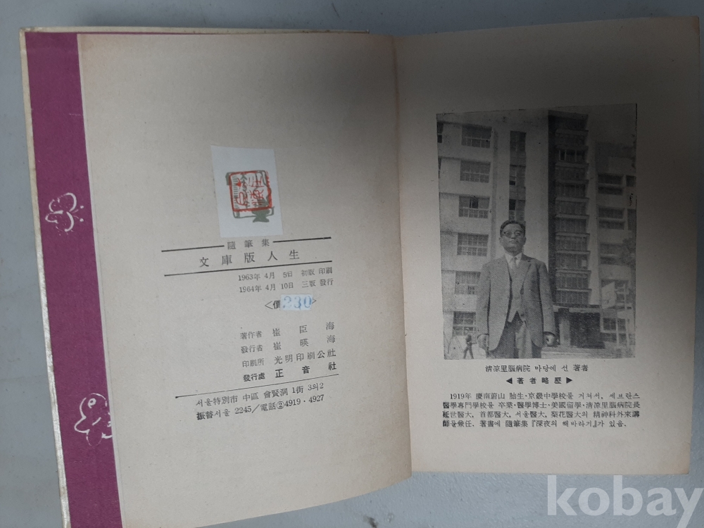 문고판인생-최신해 수필집 1964년4판 정음사 발행 표지화 컷 이우경