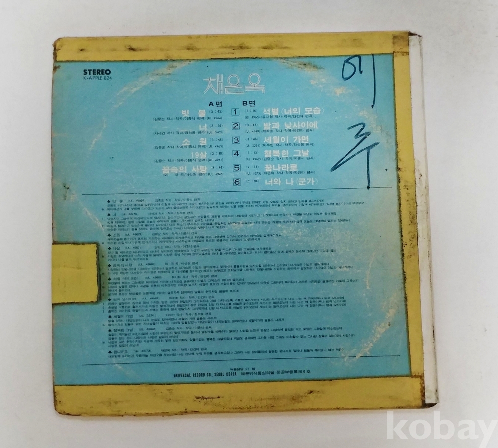| 자켓상태 | VG : 주름, 접힘, 모서리 찢김 다수 | 음반상태 | EX : 재생에 영향 없는 가벼운 기스 존재 | 발매정보 | 알수없음 | 가사지여부 | 무 |
