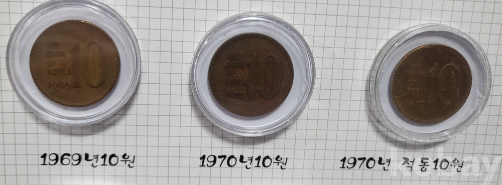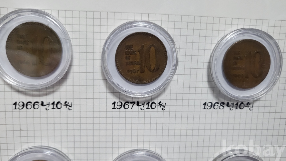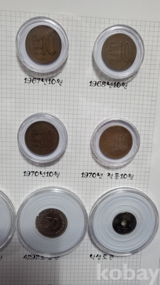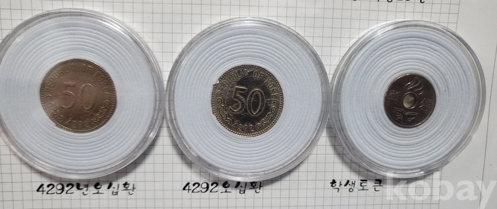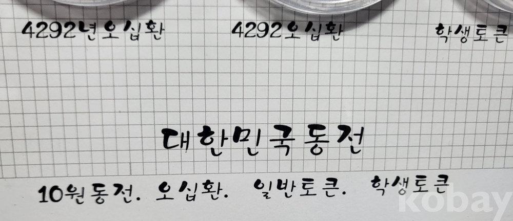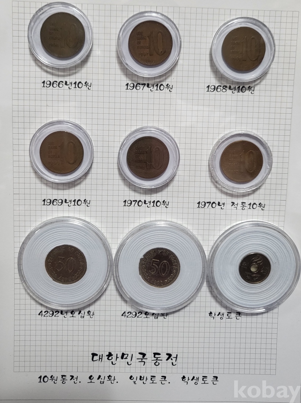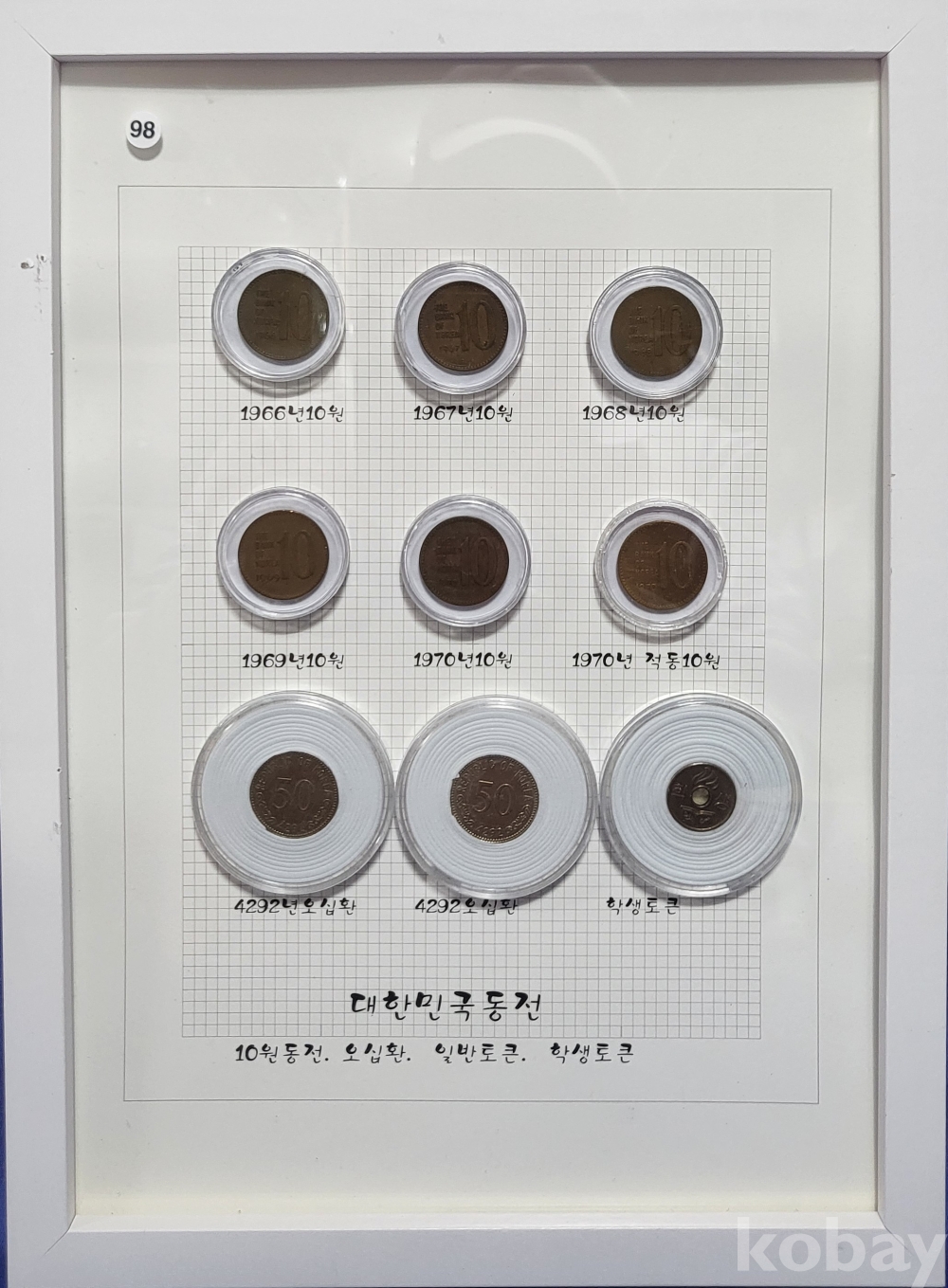대한민국 동전 10원 오십환 일반토큰 학생 토큰 9개 들어있는 액자입니다,